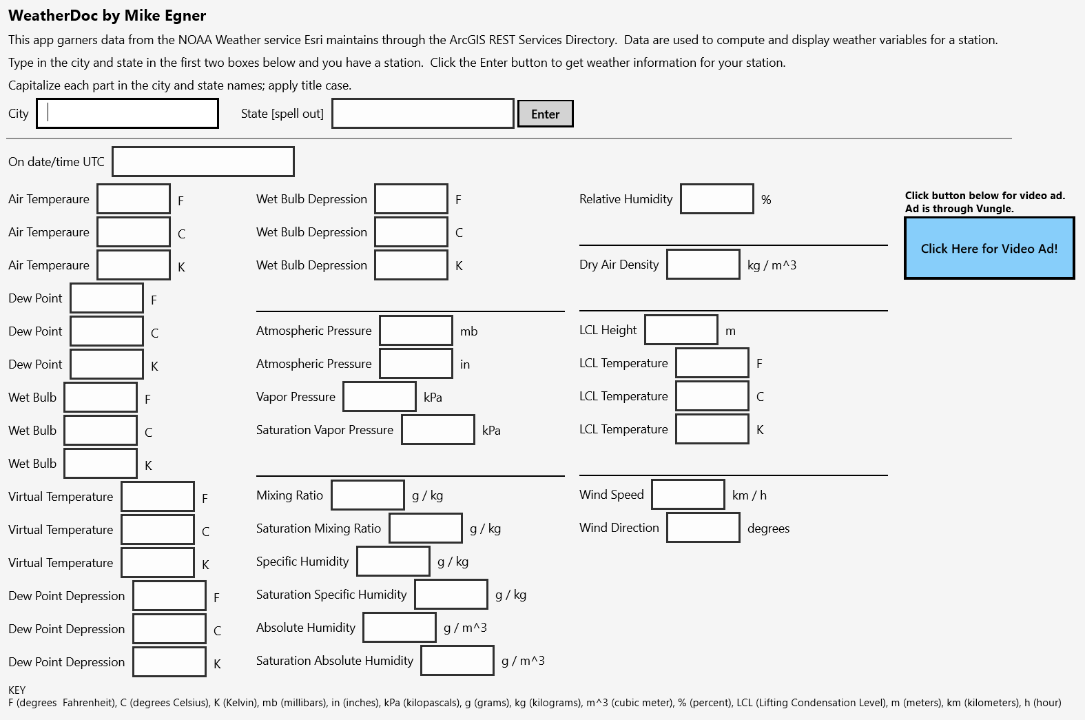 WeatherDoc is an app on which weather variables are featured for a station at a date/time. This app obtains live, real-time data from the NOAA Weather service. Esri supports the NOAA service through the ArcGIS REST Services Directory. Data are used to compute and display variables.