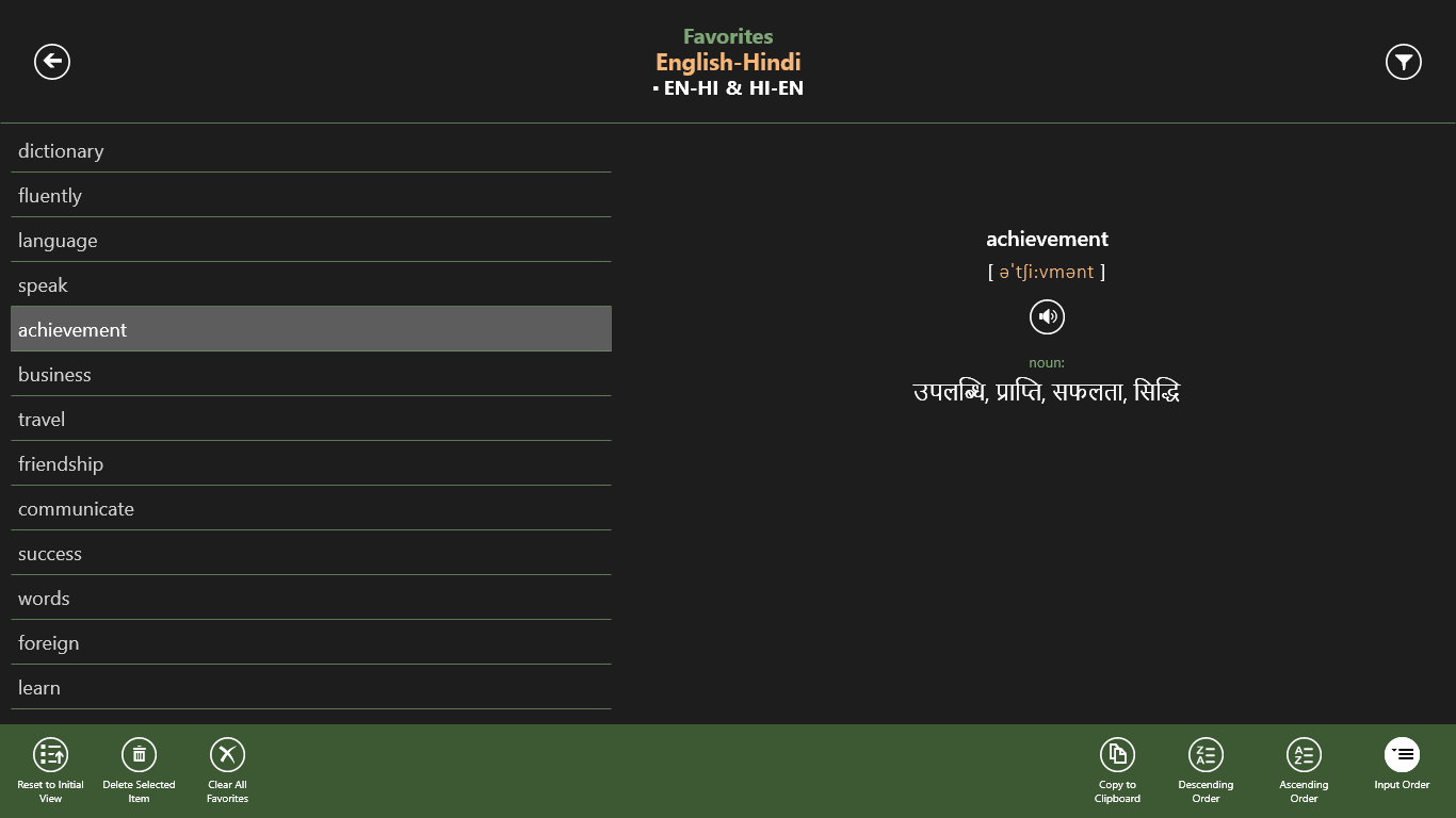 Offline dictionaries for 8 foreign languages.Fast switching between languages.Comfortable and fast search with predictive text input.Review the History of translated words, sort and group your Favorites list.Memorize words from the selected dictionary or your Favorites list by using electronic tutor.Listen to the pronunciation of words (Internet connection is required).