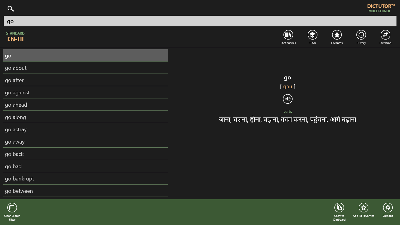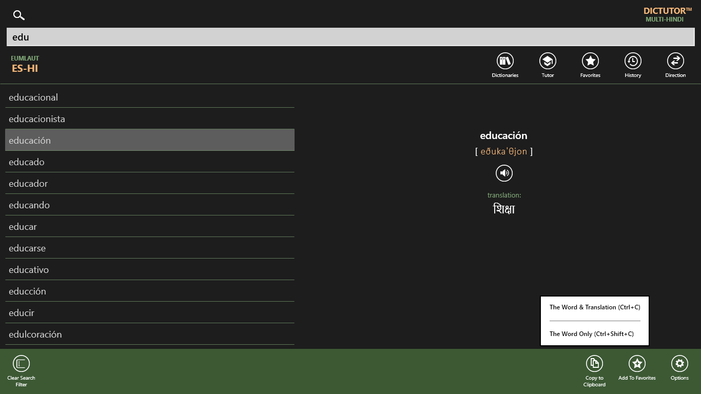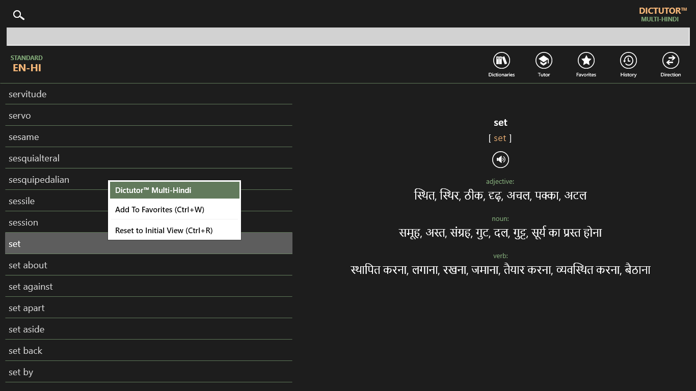 Dictutor MULTI-HI is an impressive bundle of 8 offline dictionaries with electronic tutor for Hindi speaking users. It’s the powerful tool for mastering foreign languages. Dictutor lets you instantly translate and effectively learn new foreign words.