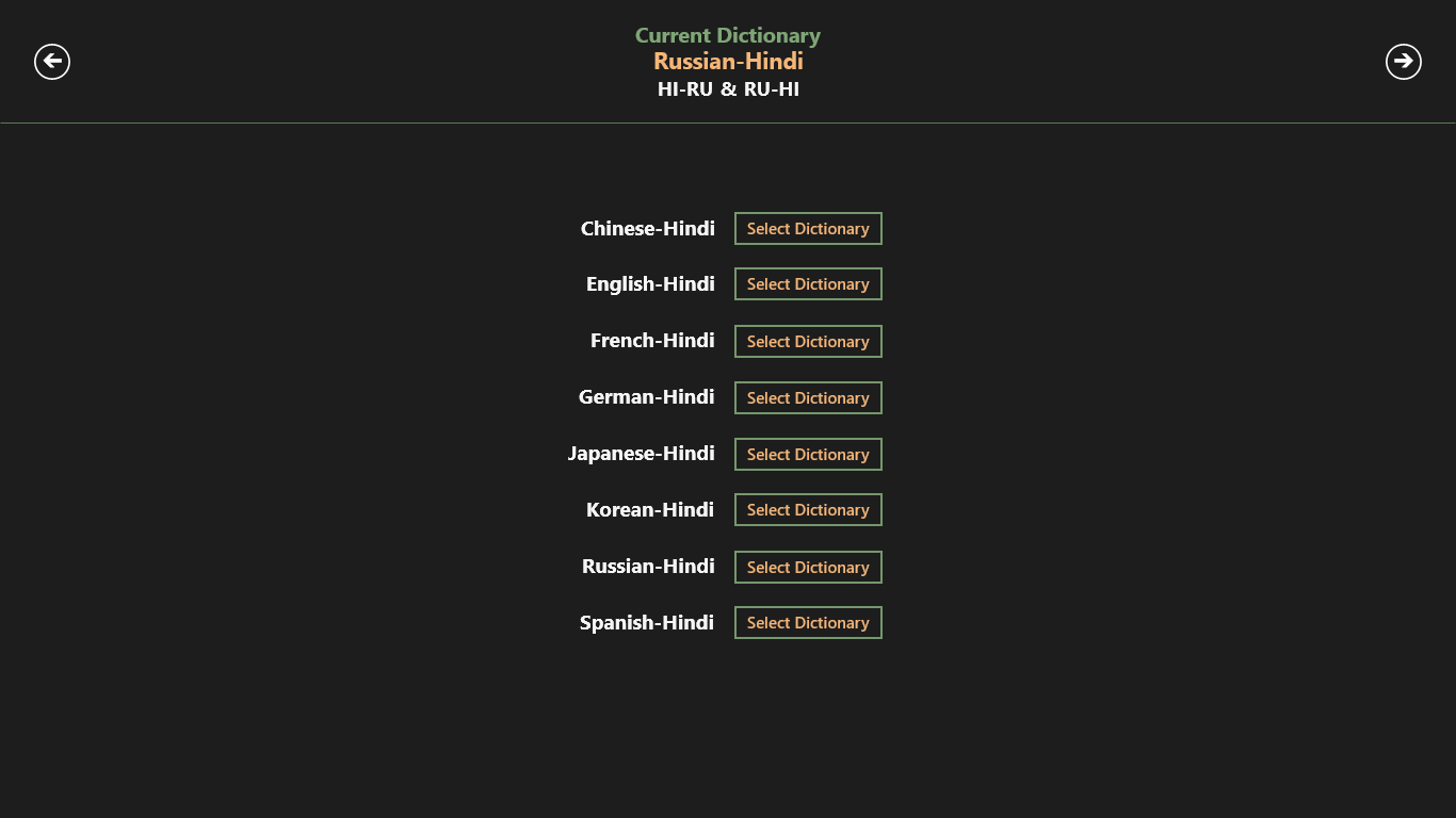Dictionaries for 8 languages: Hindi to Chinese, English, French, German, Japanese, Korean, Russian, Spanish.