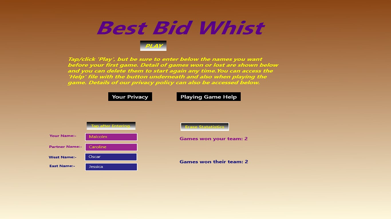 Best Bid Whist is the best in the sense that the look, animations and play of the robots are as good as possible. All the difficult scoring is done for you and best of all you can download for a 7 day free trial before you are asked for a very modest amount of money for free play. Nothing could be more fair.
