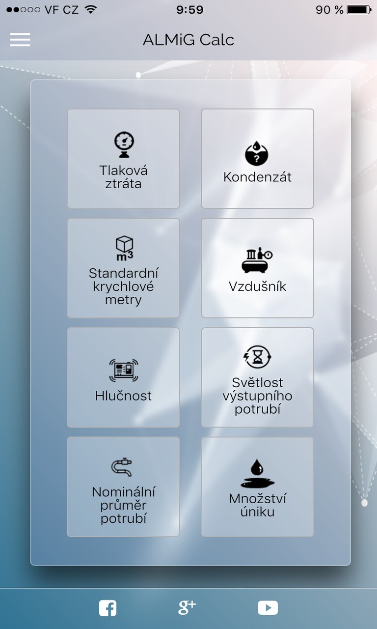 Česky: Snadný nástroj na výpočty stlačeného vzduchu, výpočty tlakových ztrát v potrubní síti, množství kondenzátu během komprese, standardní krychlové metry dle norem DIN 1343 a ISO 2533, optimální velikost vzdušníku na stlačený vzduch, hlučnost, světlost výstupního potrubí, matematický výpočet minimálního průměru potrubí a zjištění množství úniku.