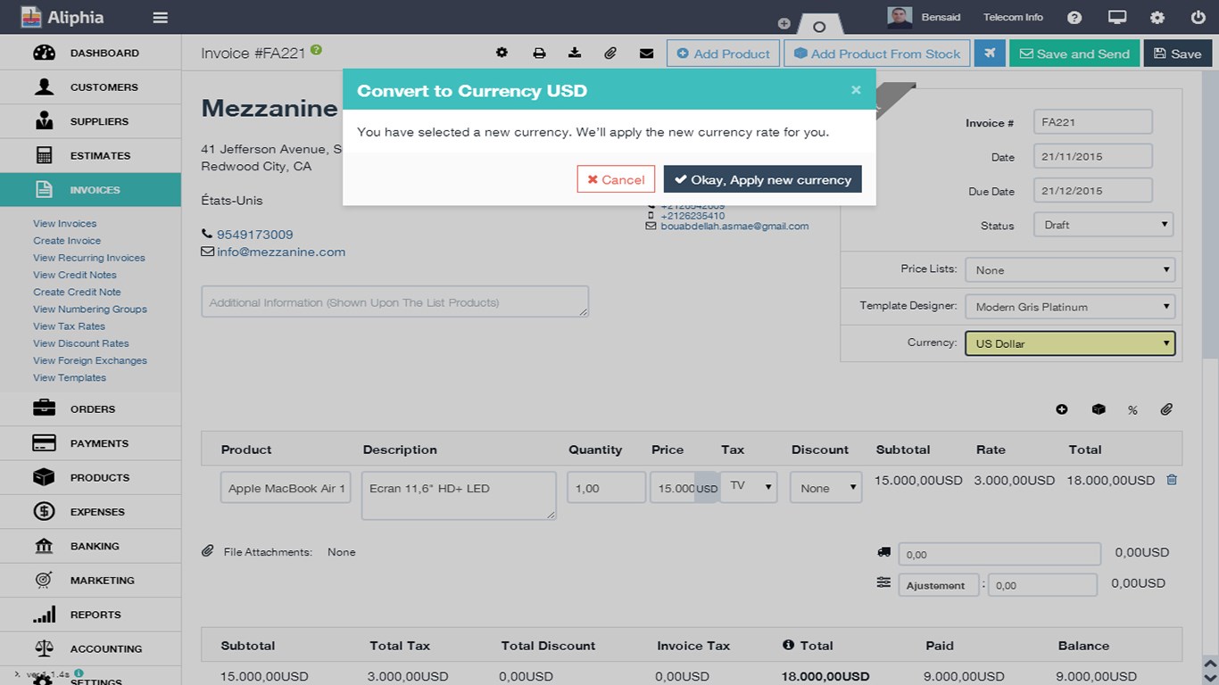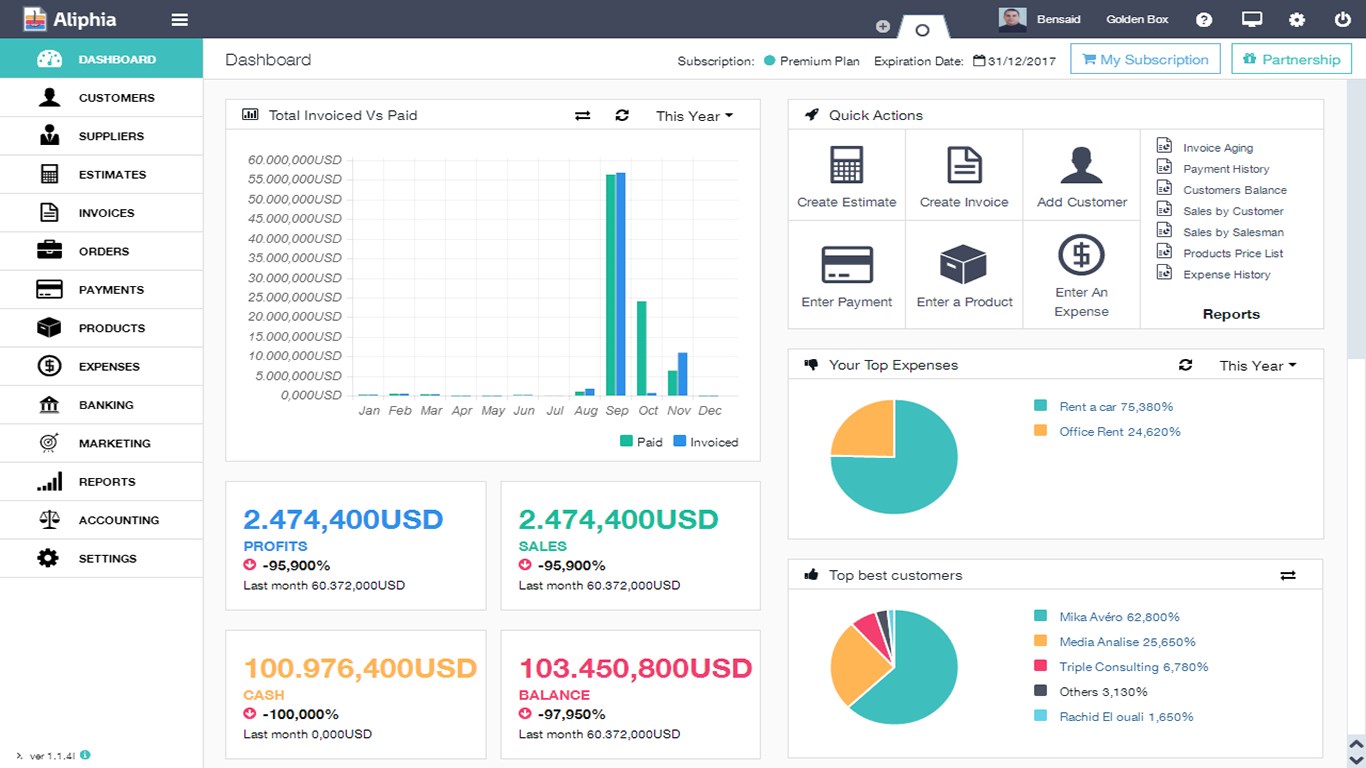 Aliphia supports three different languages : English, Arabic and FrenchCreate and Customize your own invoices (you can also use the invoice templates provided by the application)Multi-currency systemAccept Online payment using Web InvoicesAutomatic payments processingUnlimited number of customers, suppliers, users and products/servicesImport data to your account in no timeAutomate recurring invoicesTrack and analyze the entire activity of the company thanks to the dynamic dashboardOnline stock management system to keep you on the ballIdeal for both products and services business