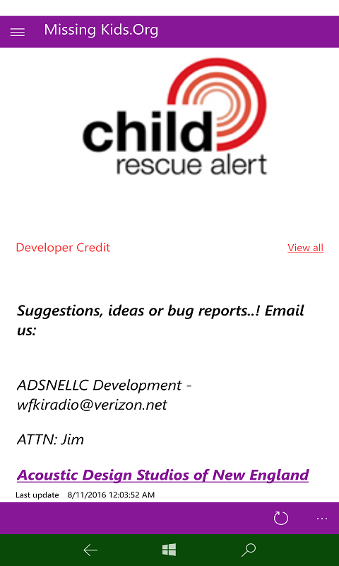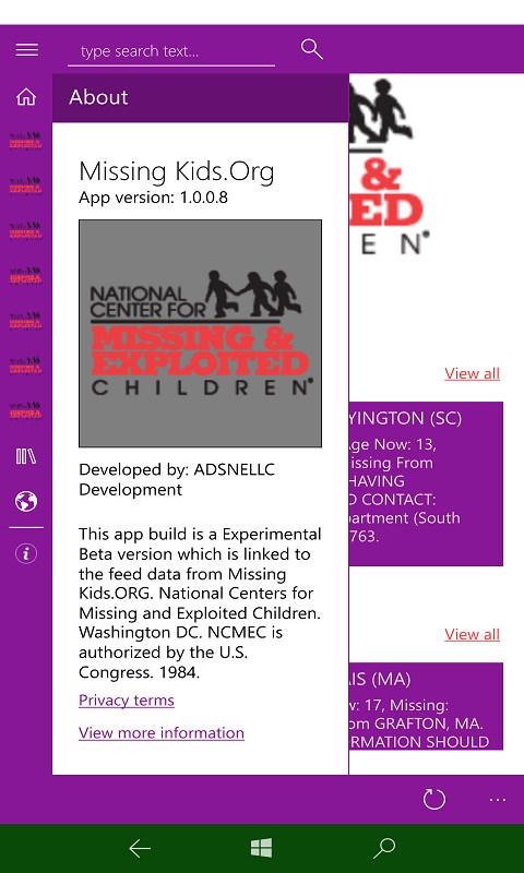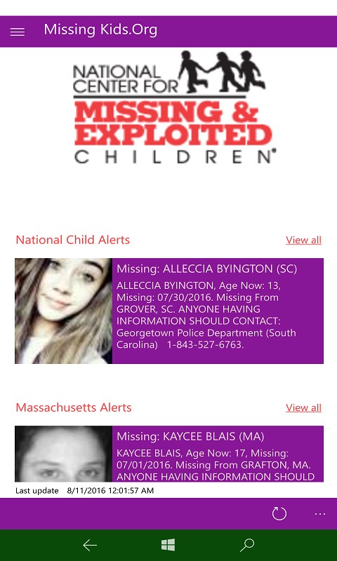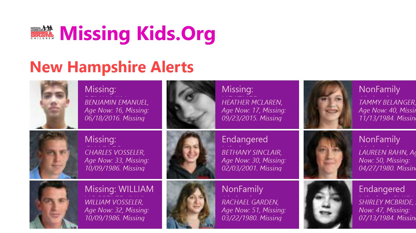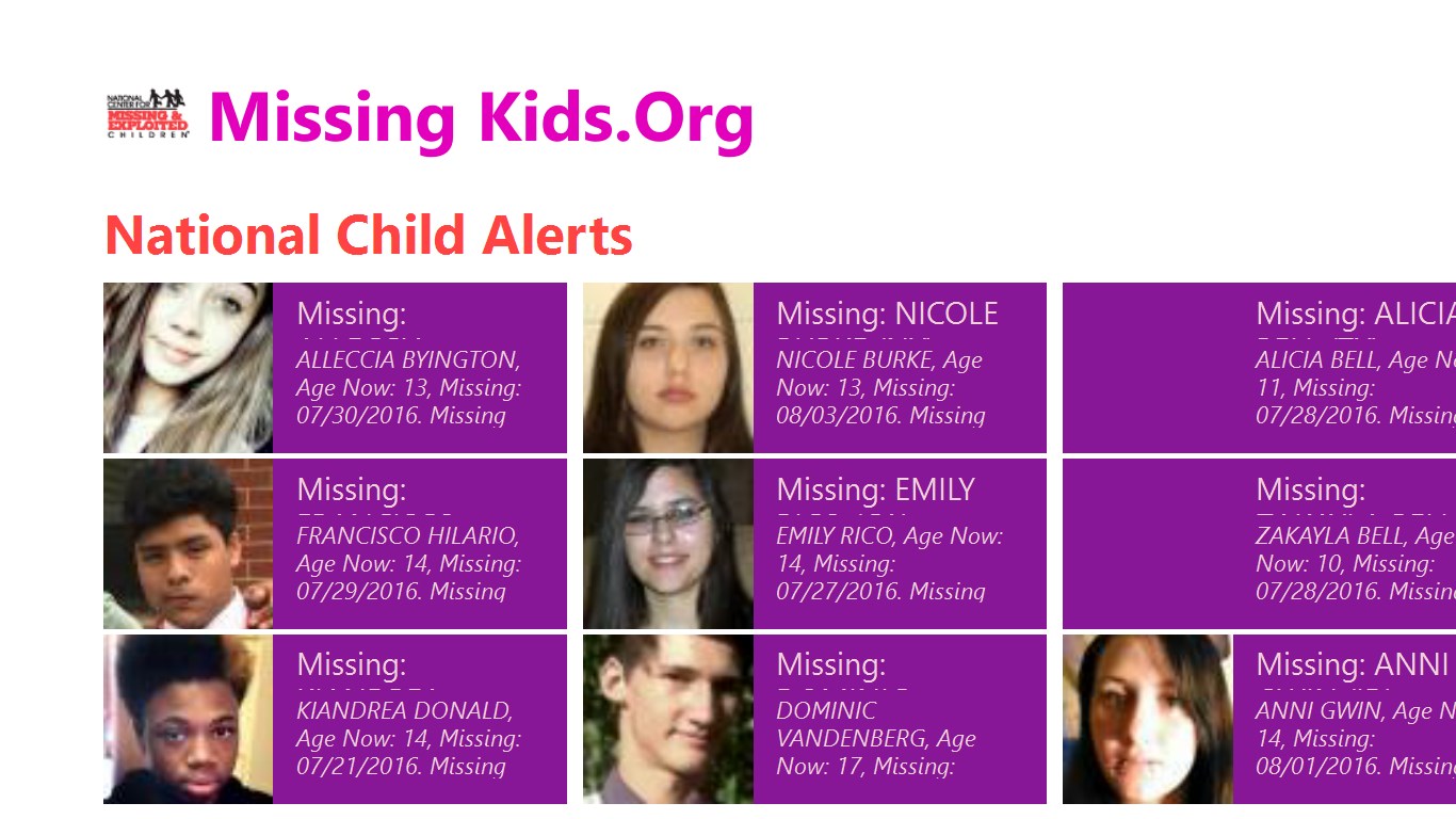 This app build is for Windows 8.1 devices. Free to the public from the National Centers for Missing & Exploited Children. For a full working version, please upgrade to Windows 10 and install our Windows 10 NCMEC app for the Windows 10 platform.