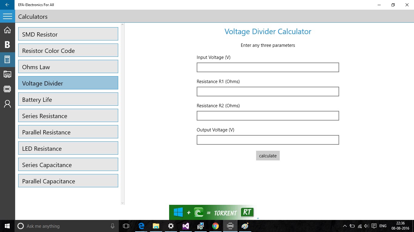 2. Calculators - Contains various electronics calculators like, SMD Resistor, Colour code, Ohm's law, Series and Parallel Resistance, Series and Parallel Capacitance, Battery Life, LED Resistance and Voltage Divider.