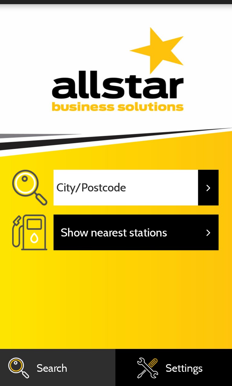 Optimisation of interface to enhance search functionality, improve overall user experience & bring inline with AllStar brand. A tab system on the search page allows users to navigate between settings and search. When a search is conducted, pins with station locator now appear with correct design pop up and description. From this screen users can now navigate back begin a new search.