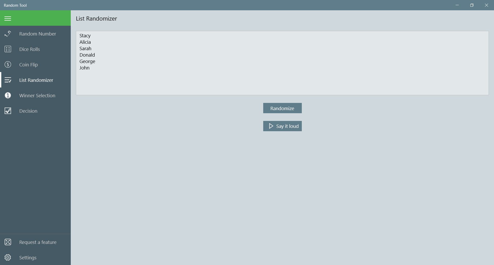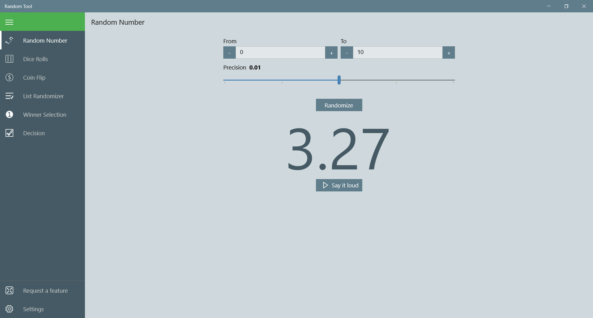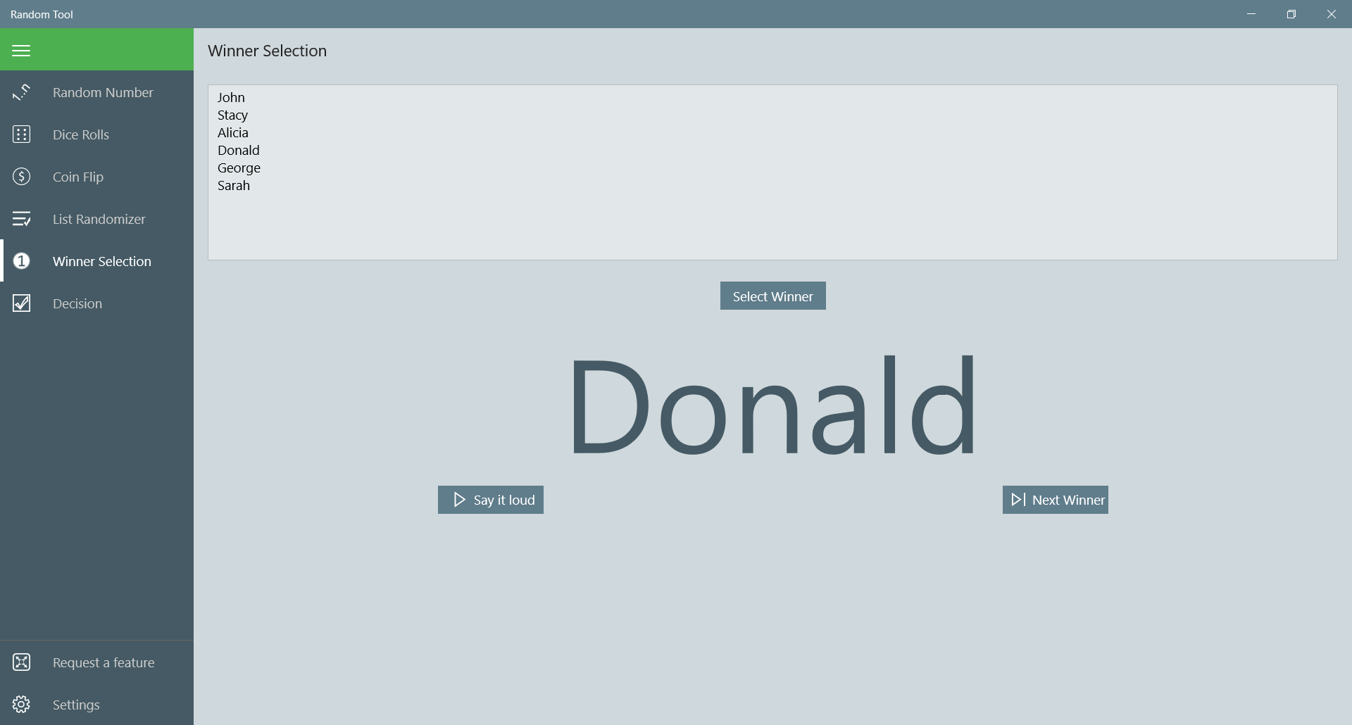 Generate random numbers within selected rangeShuffle list of entriesSelect a winnerDecision makerCoin flipperDice rollerText-to-speech