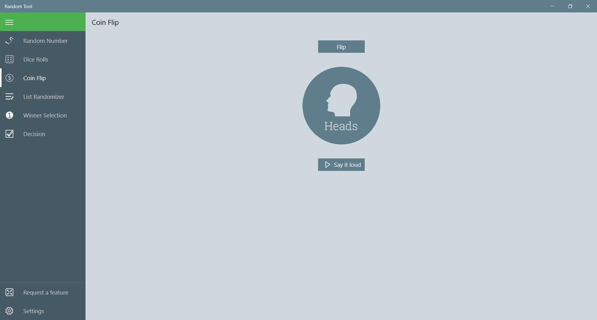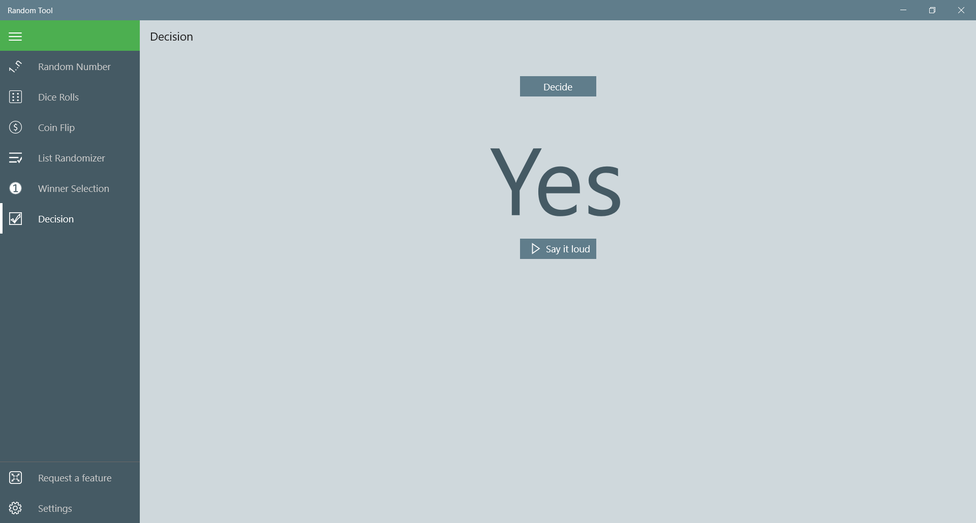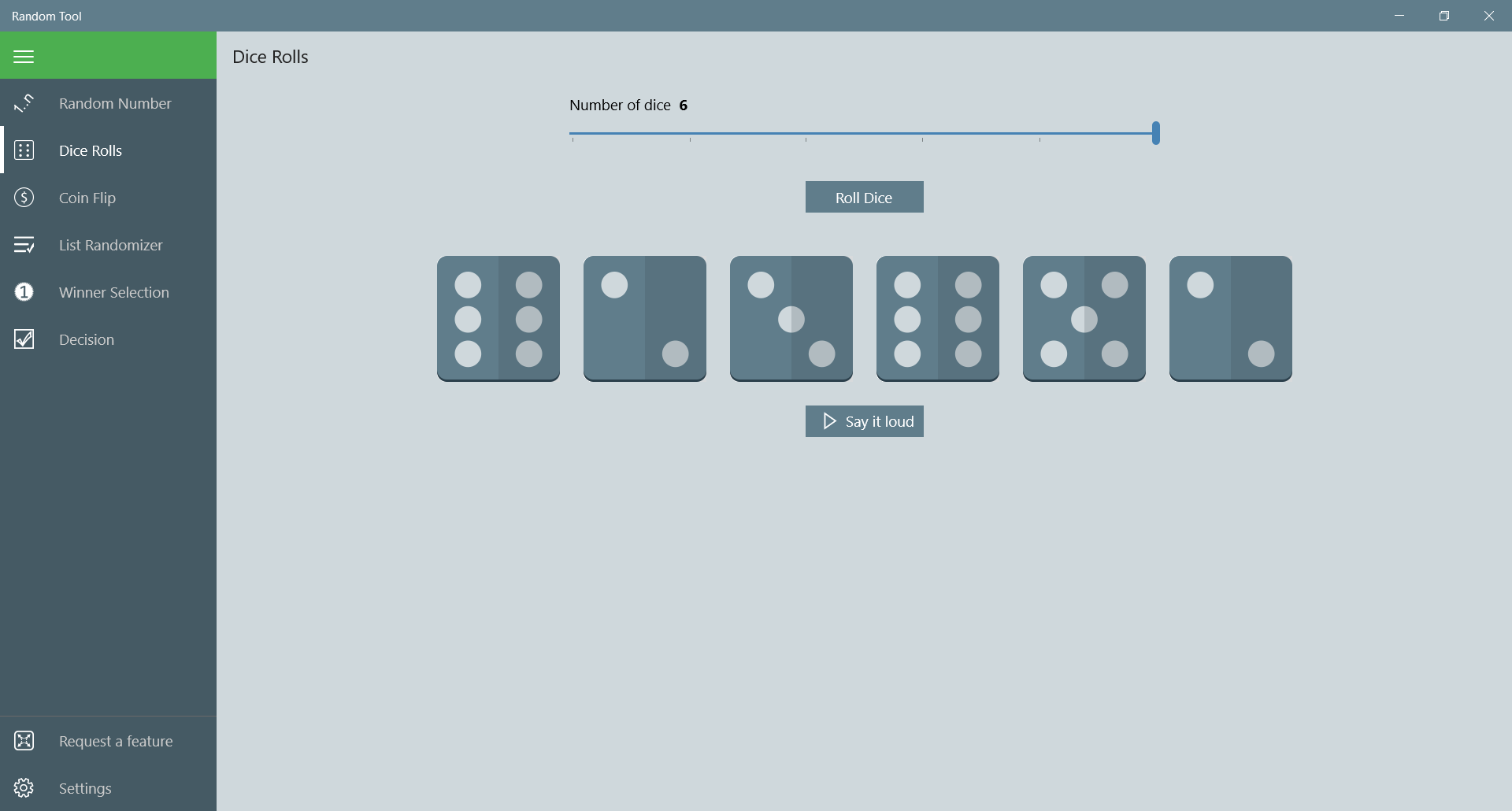 Generate random numbers within selected rangeShuffle list of entriesSelect a winnerDecision makerCoin flipperDice rollerText-to-speech