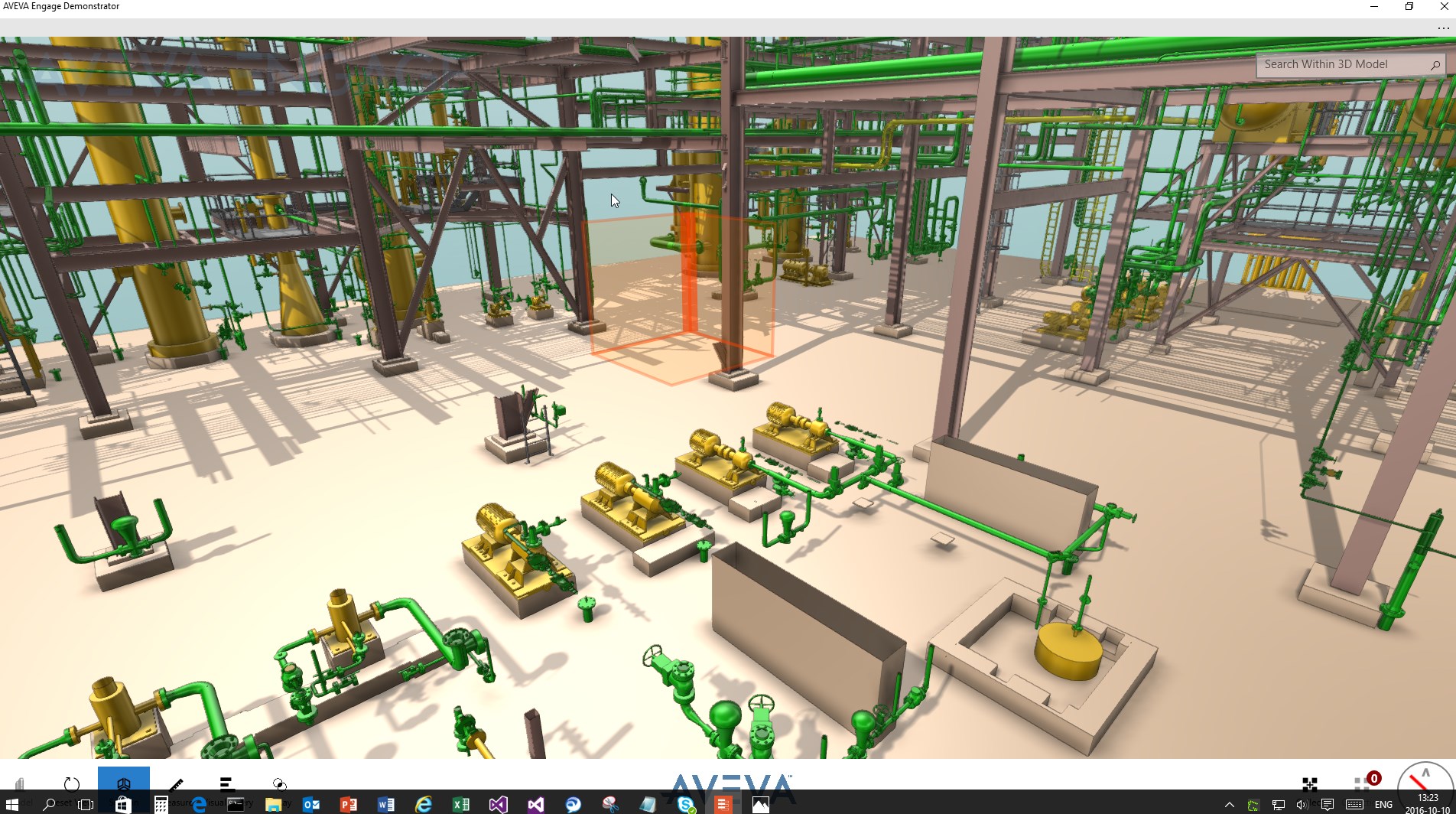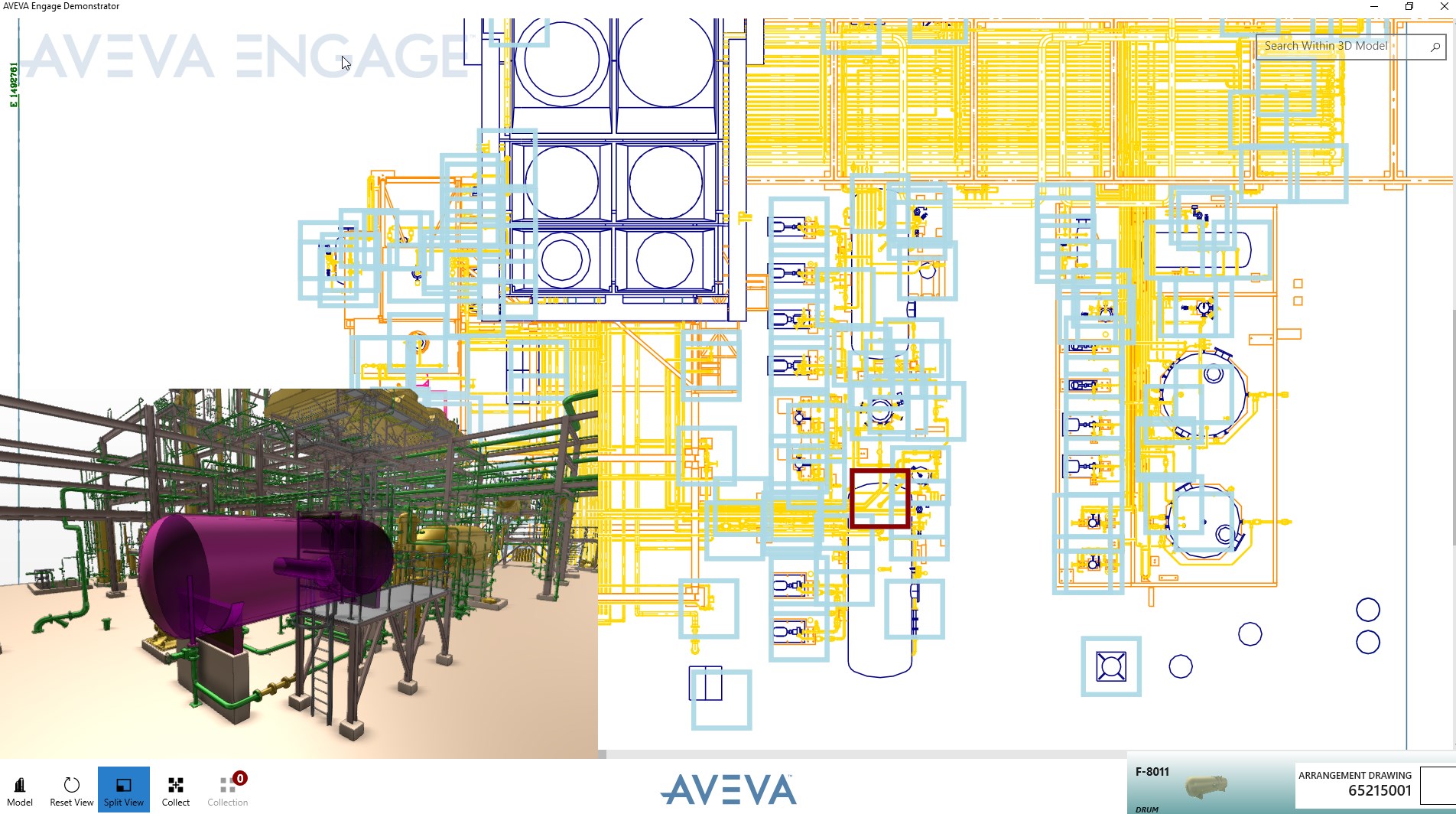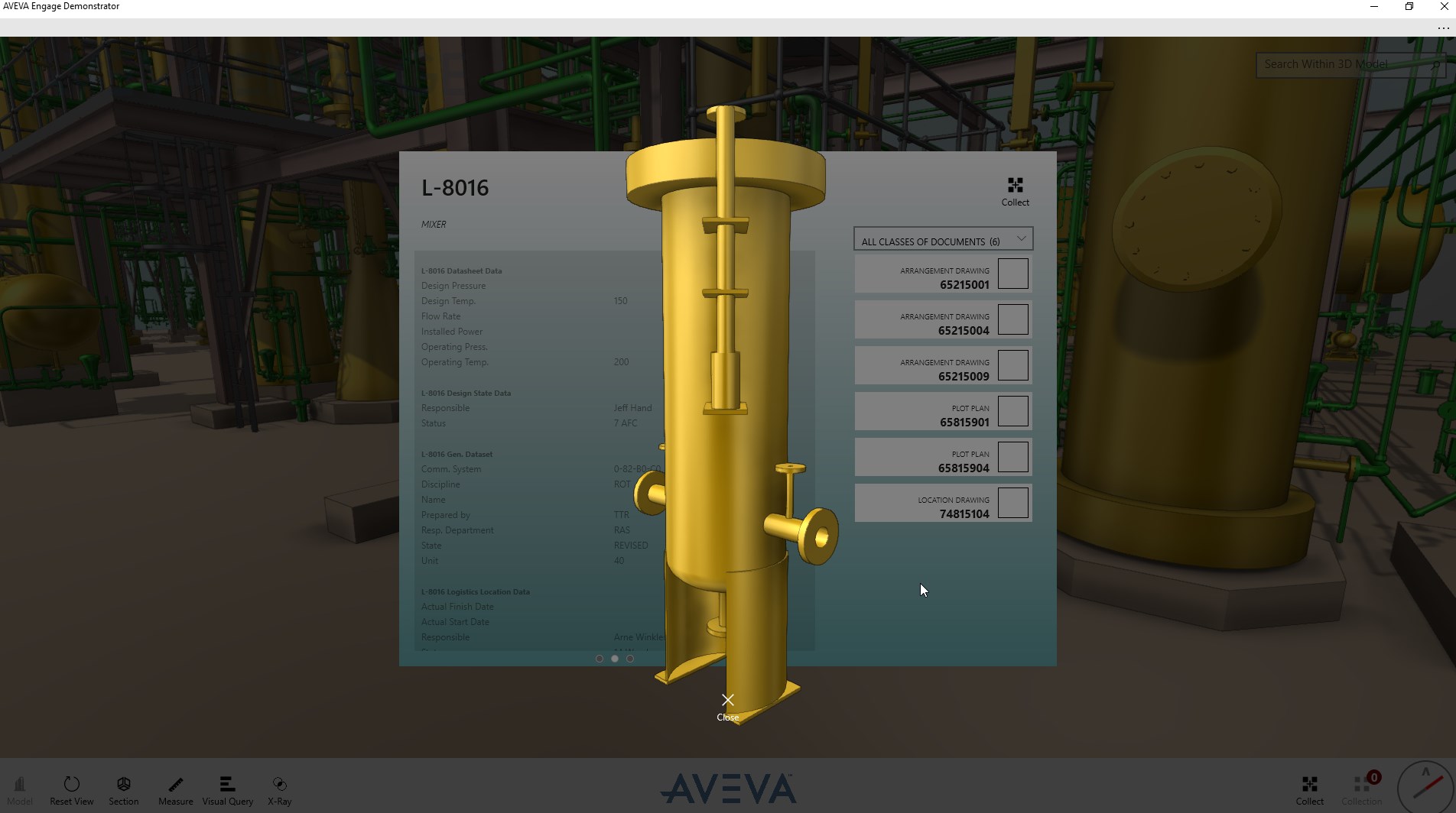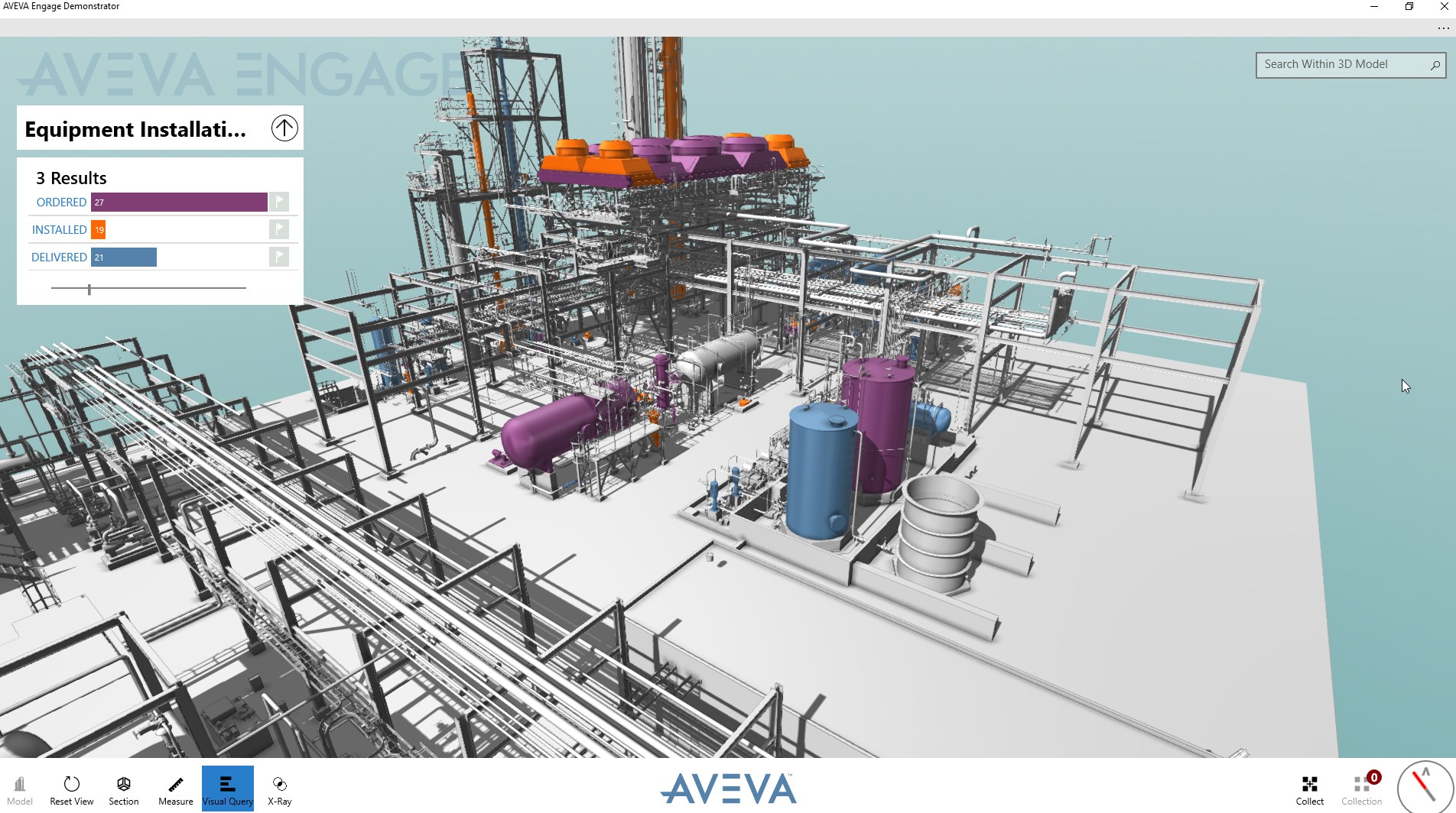 AVEVA Engage Demonstrator allows you to view and explore a sample digital plant in stunning ultra high resolution 3D. Search and navigate the model, visualise queries, perform measurements and access a wealth of aggregated contextual data and drawings that form the most complete picture of the digital asset.