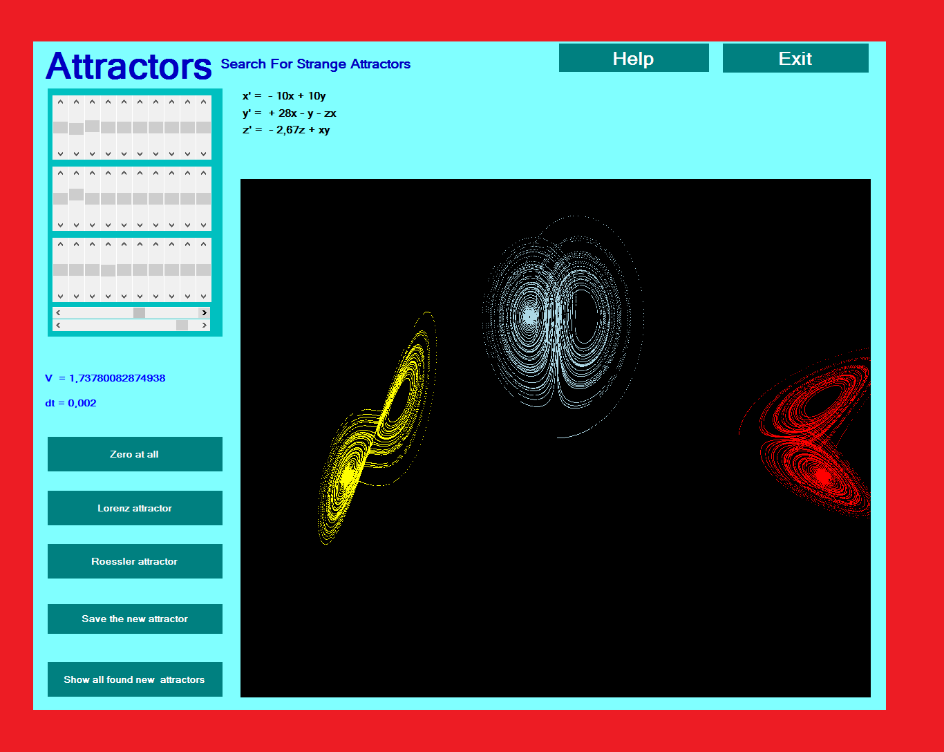 The 60 coefficients correspond to 60 scroll bars in „Attractors“. The solution of the ODE system is shown as trajectories in the phase space. Changing the scroll bars (i. e. the coefficients) is immediately shown as changed trajectories. Found new Strange Attractors may be saved.