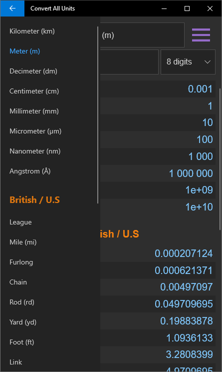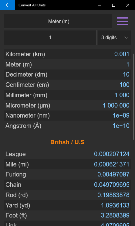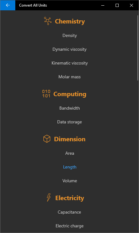 • 36 measurements: Acceleration, Angle, Area, Bandwidth, Capacitance, Data storage, Density, Dynamic viscosity, Electric charge, Electric current, Electric potential, Electrical conductance, Electrical resistance, Energy, Force, Frequency, Illuminance, Inductance, Kinematic viscosity, Length, Magnetic field, Magnetic flux, Mass, Mass flow rate, Molar Mass, Numerals, Power, Pressure, Radiation, Radioactive decay, Speed, Temperature, Time, Torque, Volume, Volumetric flow rate
