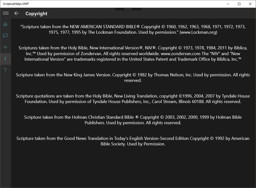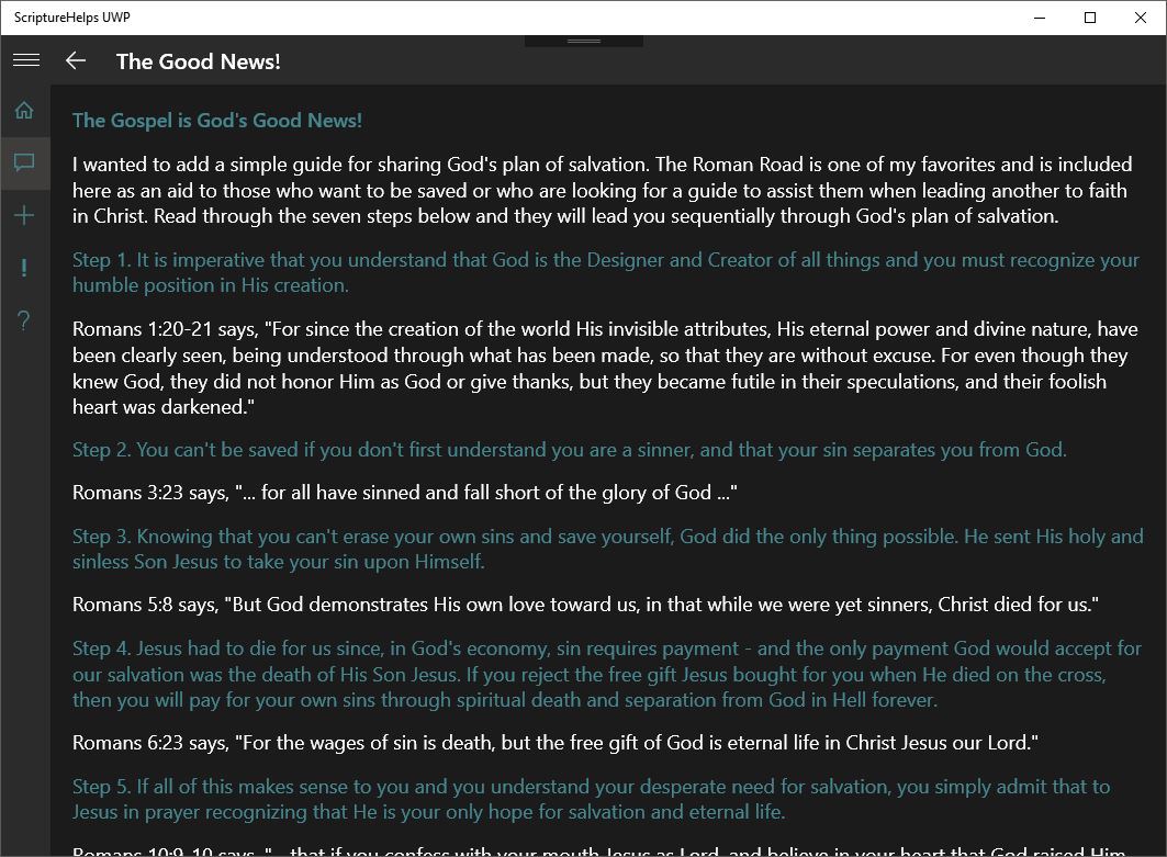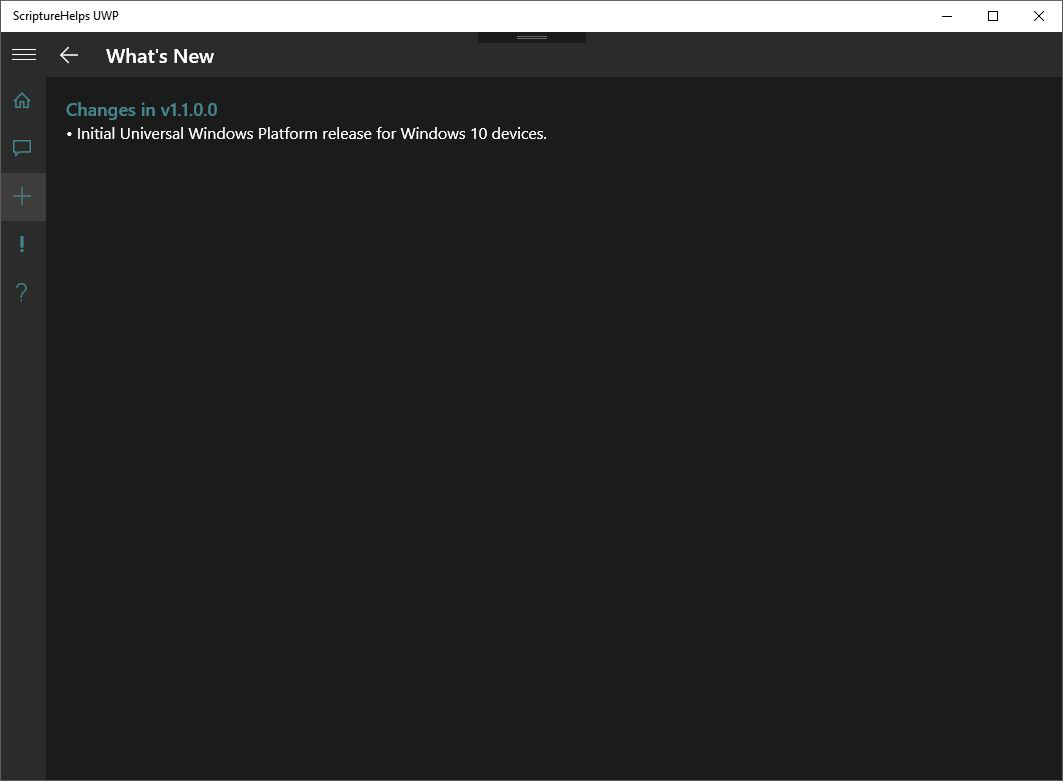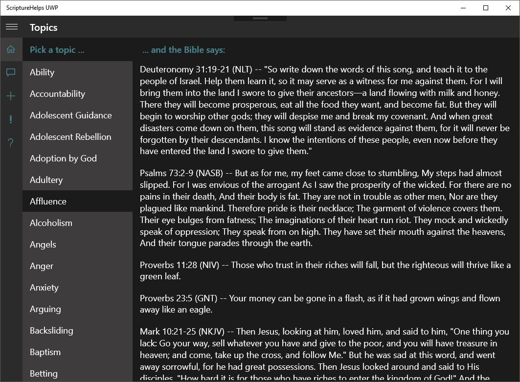 While I understand this isn't a very complicated application, I do believe it provides helpful information that can be a blessing to you or those to whom it is offered. I plan to continue updating ScriptureHelps UWP with new topics and Scriptures on a fairly regular basis. Users are also encouraged to send me emails suggesting new topics and/or scriptures. If you like my application, please take a few moments to rate and review it in the Windows Store.