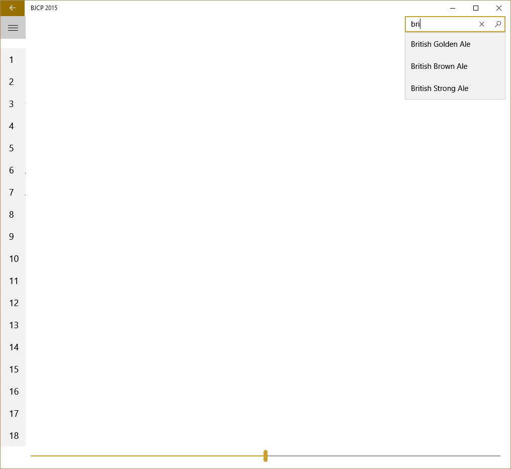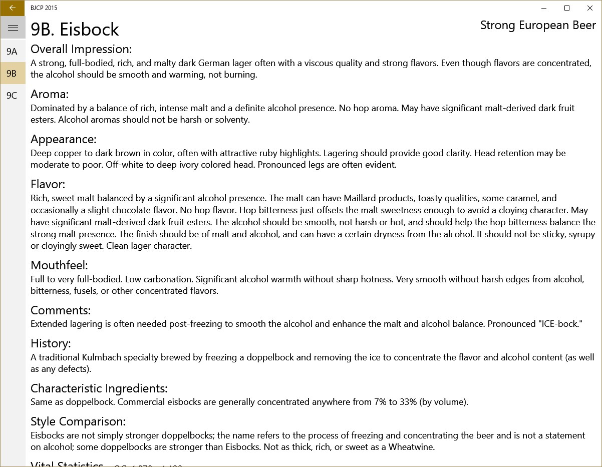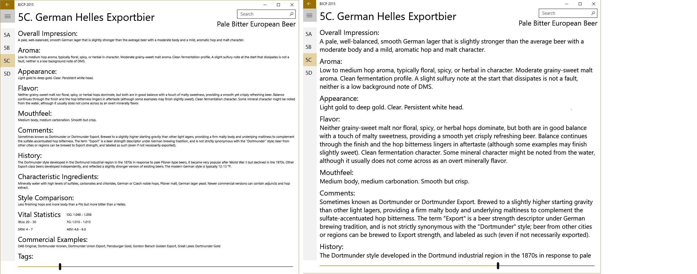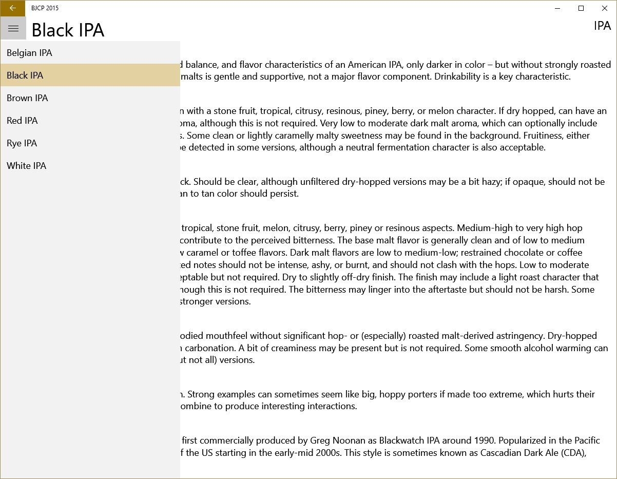 The perfect companion for judging or brewing beer. This app provides the full BJCP 2015 beer style guide. Look up categories and styles by number, or search by name (very handy when you haven't learned the 2015 groupings!). Adjust the text size with the slider, or use pinch & stretch.