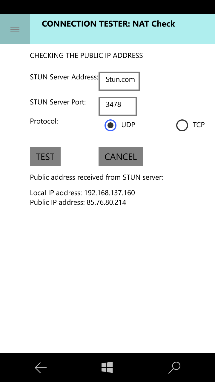 NAT CHECK: Checks the public IP address of the device via a user-defined STUN server (Session Traversal Utilities for NAT).