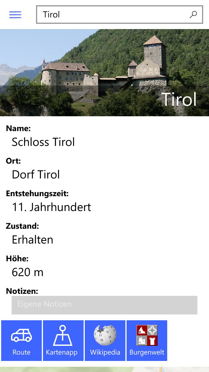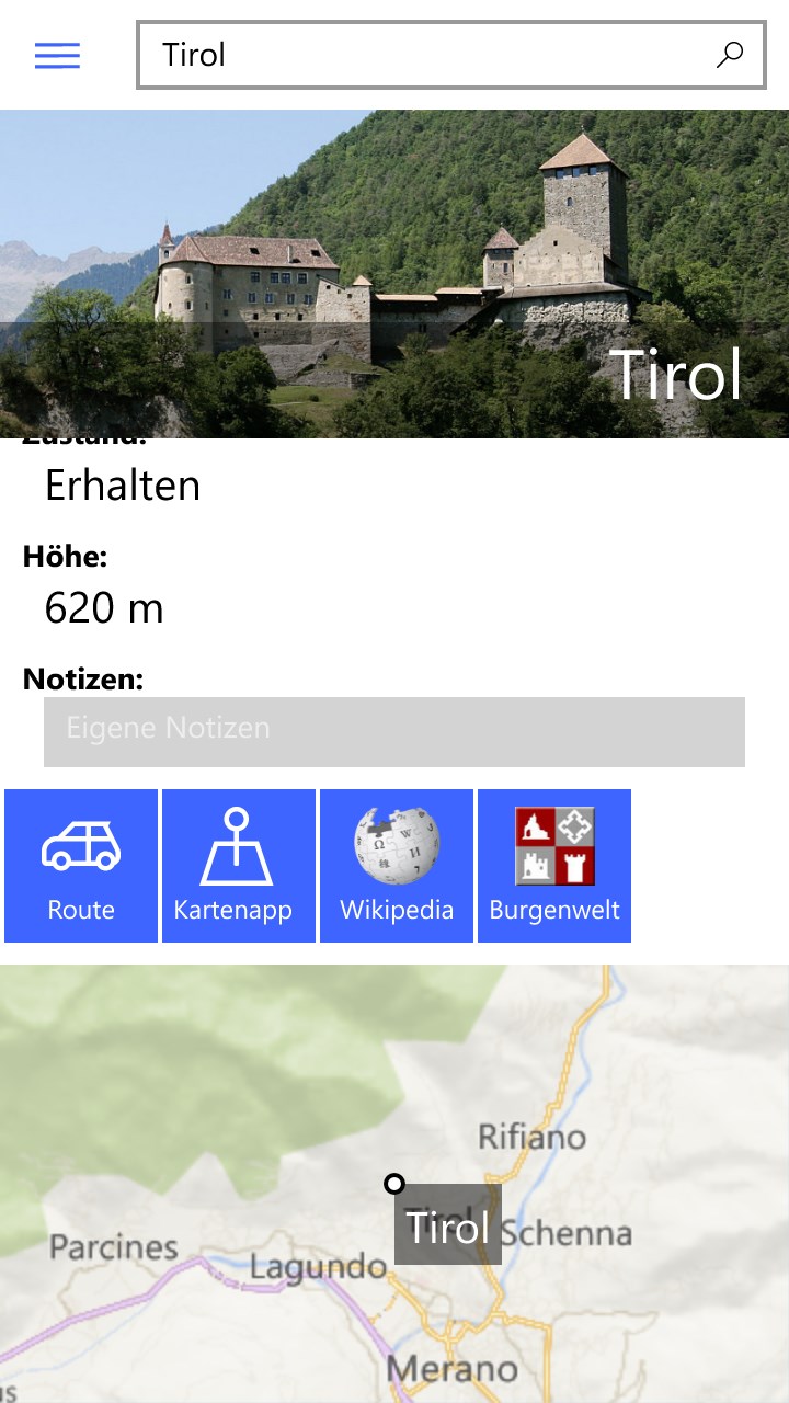 Zu jeder Burg kann eine Route vom aktuellen Standort angezeigt werden. Für weitere Informationen gibt es einen direkten Link zur Wikipedia-Seite der jeweiligen Burg, wozu eine Internetverbindung notwendig ist (wenn möglich, wird auf die deutsche Wikipedia Seite verlinkt, ansonsten auf die italienische)