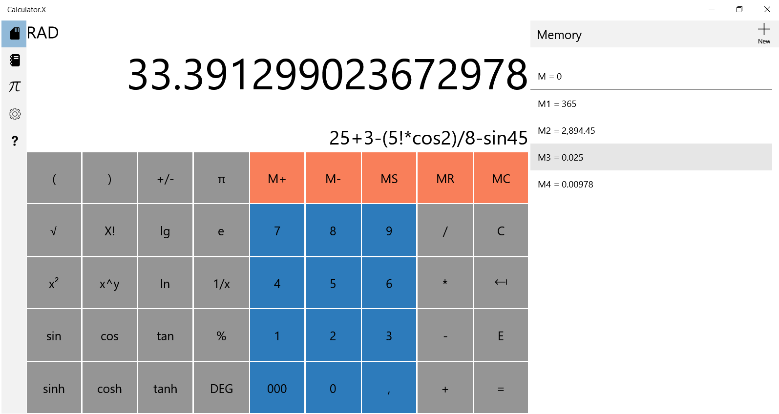 You can work with the unlimited number of memory cells. You can enter the result of calculation into the new or existing memory cell. Each memory cell has the ability to add, subtract and save the result of the current calculation. You can input the content of any memory cell into the current calculation and continue calculating.