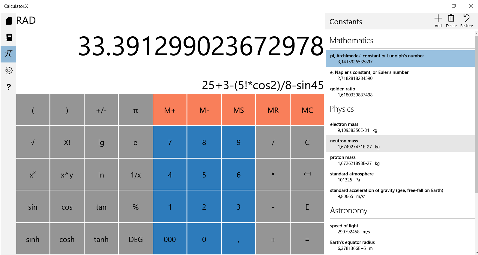 Frequently using physical, astronomical or other constants? Would like to add some new constants or remove the ones you don’t need? Want to group them the way to make it more convenient for you? With the Calculator.X, it is possible! Besides, you can edit the constants and use them in the current calculation.
