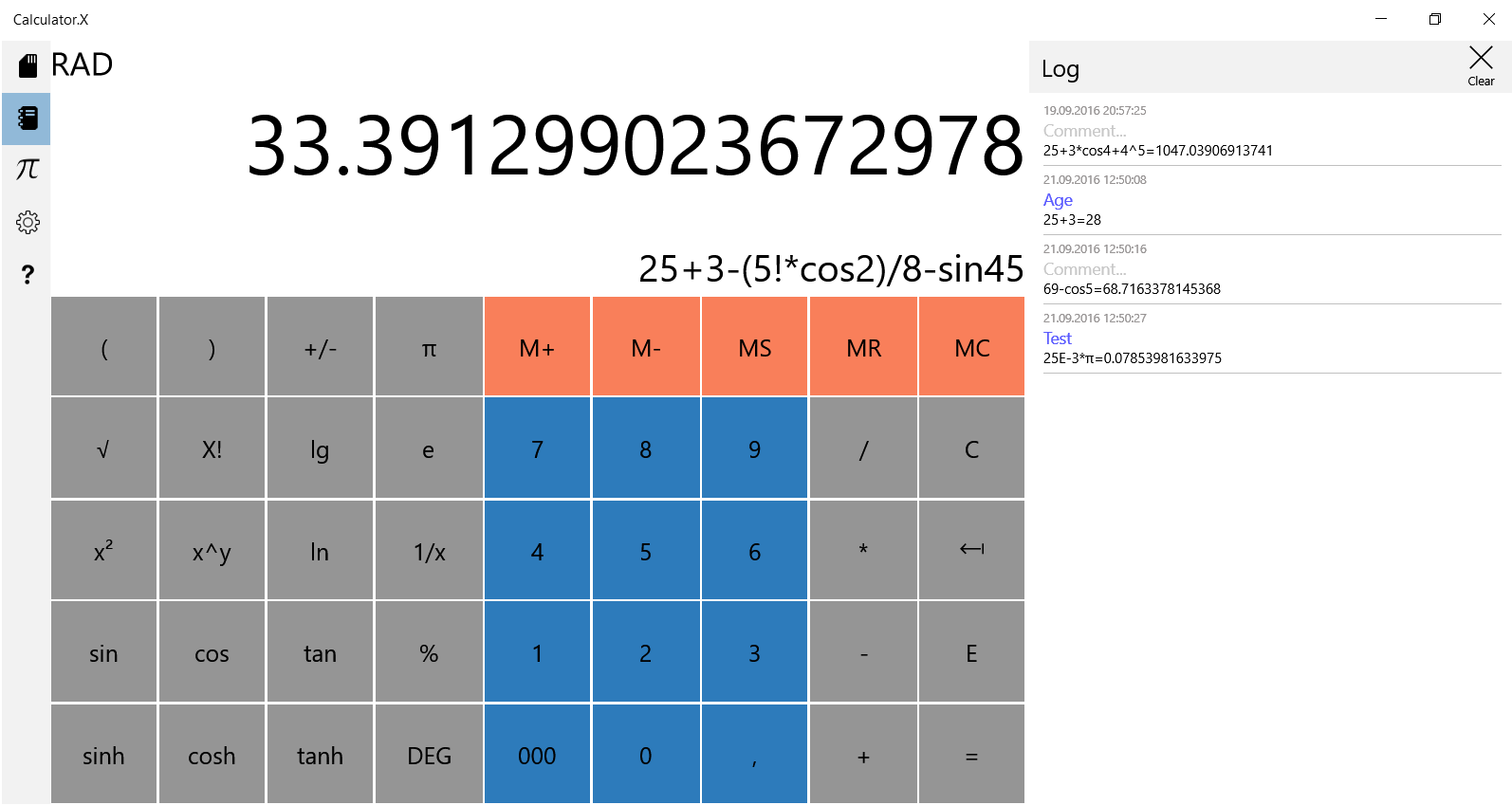 Calculator.X is not waiting for you to input the entire equation. The calculation is made as you enter each symbol. The result can be saved in any of the memory cells. Just press the “=” button and the calculation and the result will be saved in the history log.