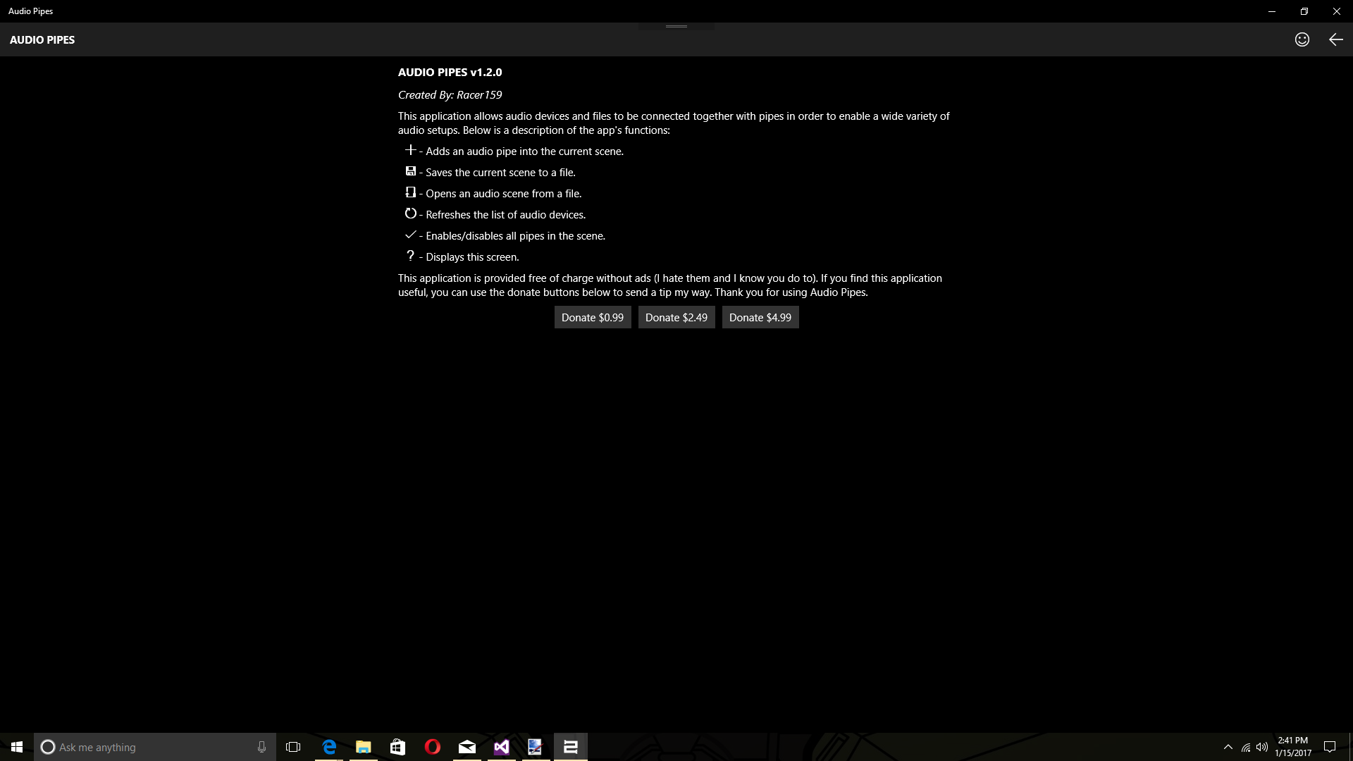 This application is provided for free without ads, but if you do find it useful, please use the donate option within the app; it is very appreciated. Thank you for checking out Audio Pipes.