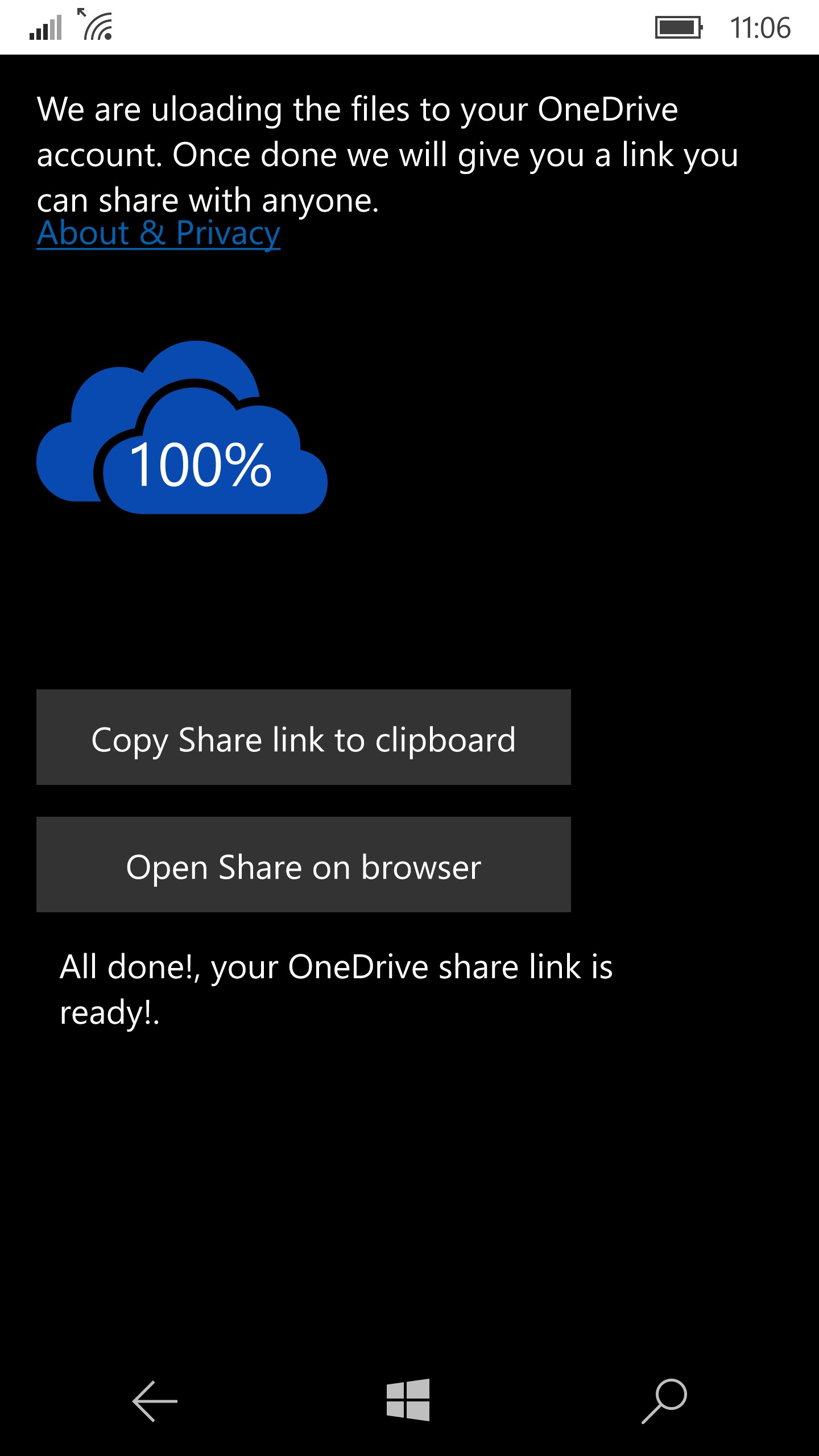 Quickly uploads videos and pictures to your OneDrive account and creates a link you can share with anyone you want. Useful to overcome the size limits of instant messaging apps and SMS.