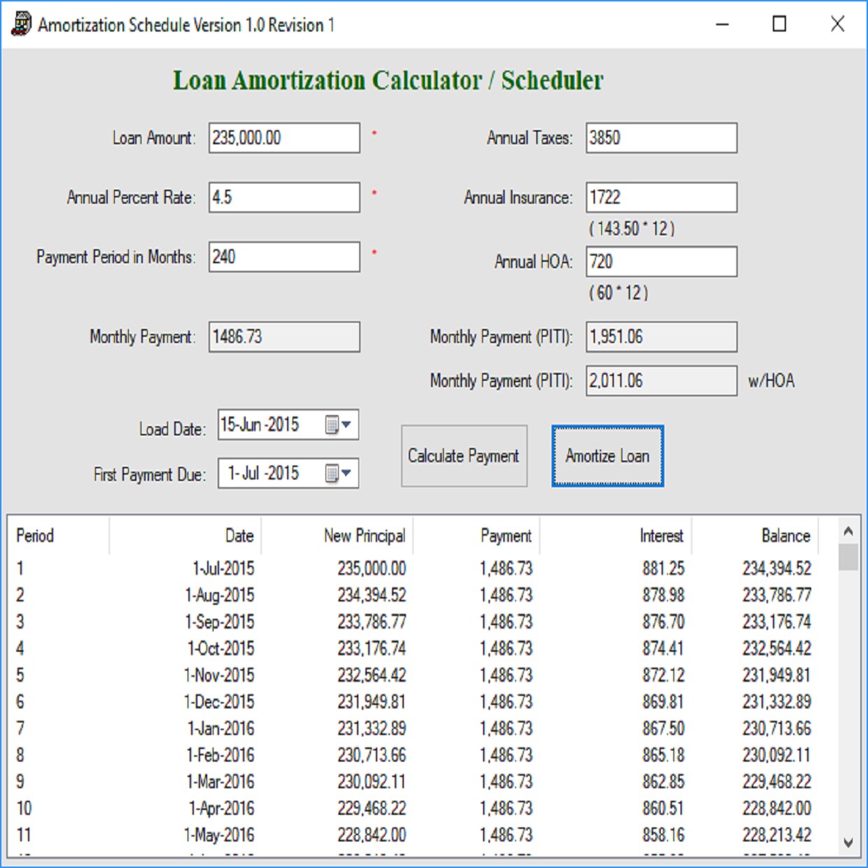 This application will compute and amortize a loan payment for any type of loan based on the loan amount, interest rate, and number of monthly payments. It will also compute PIT or PITI if those amounts are entered and provide an amortization schedule from starting date thru ending date.