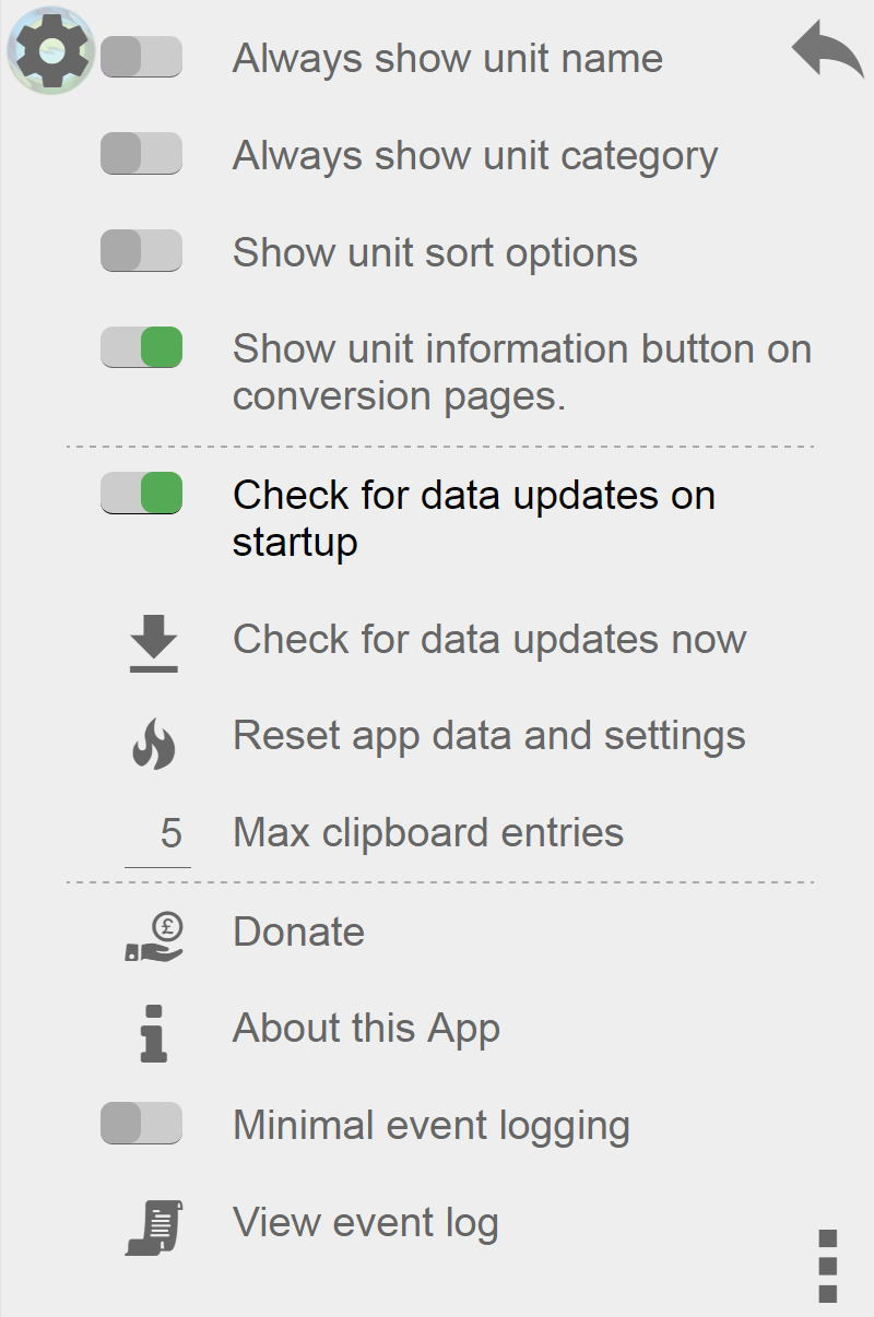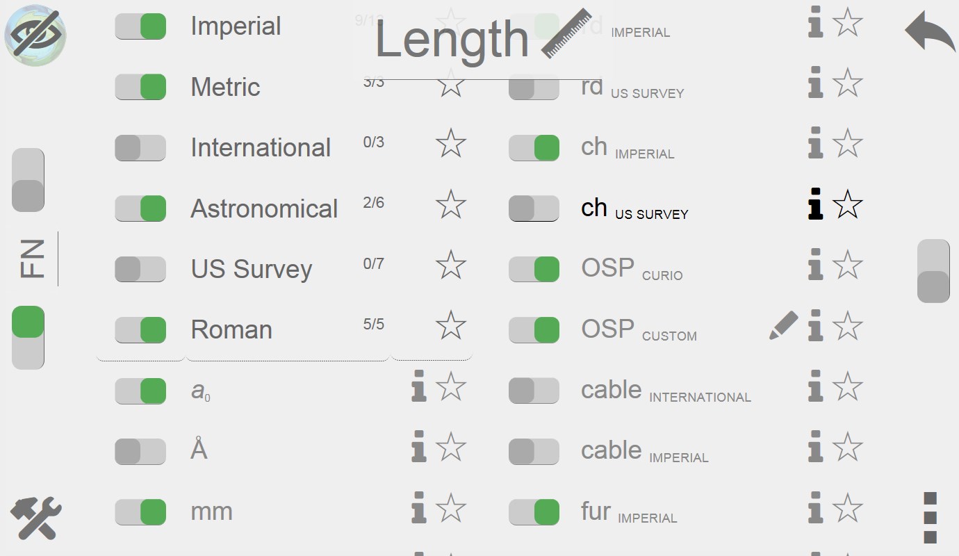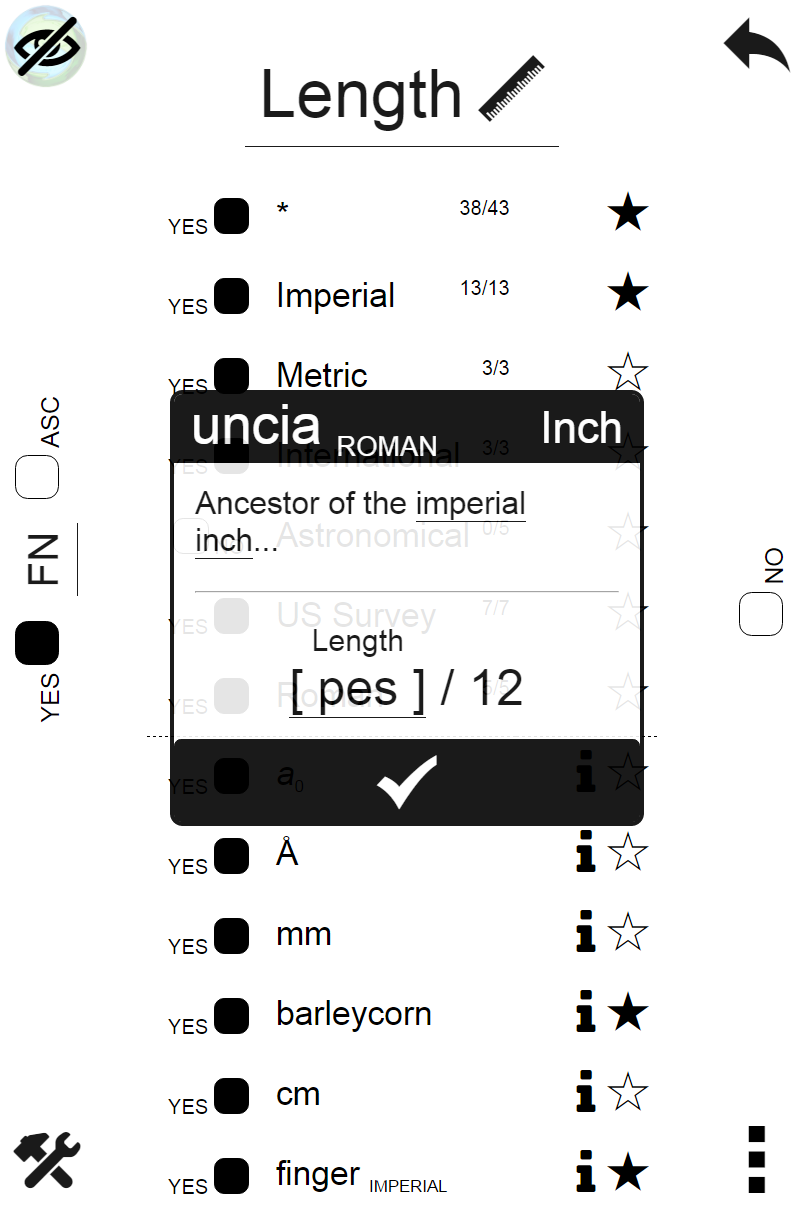 Change which units are shown on the conversion pages and view information about them. Unit details include a brief synopsis and the equation used for calculations.