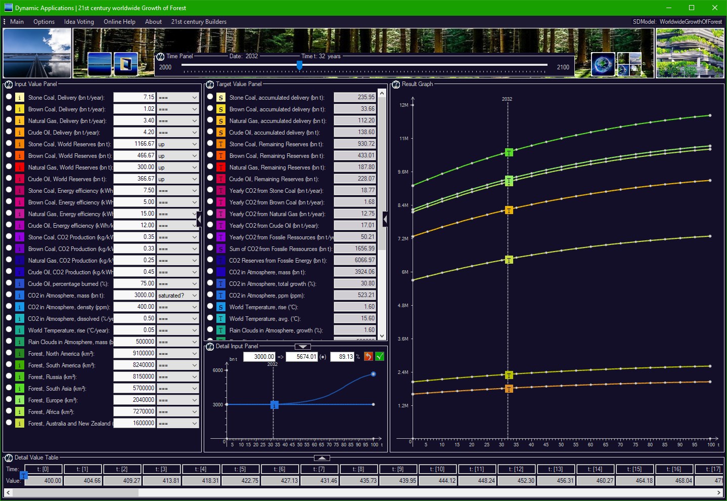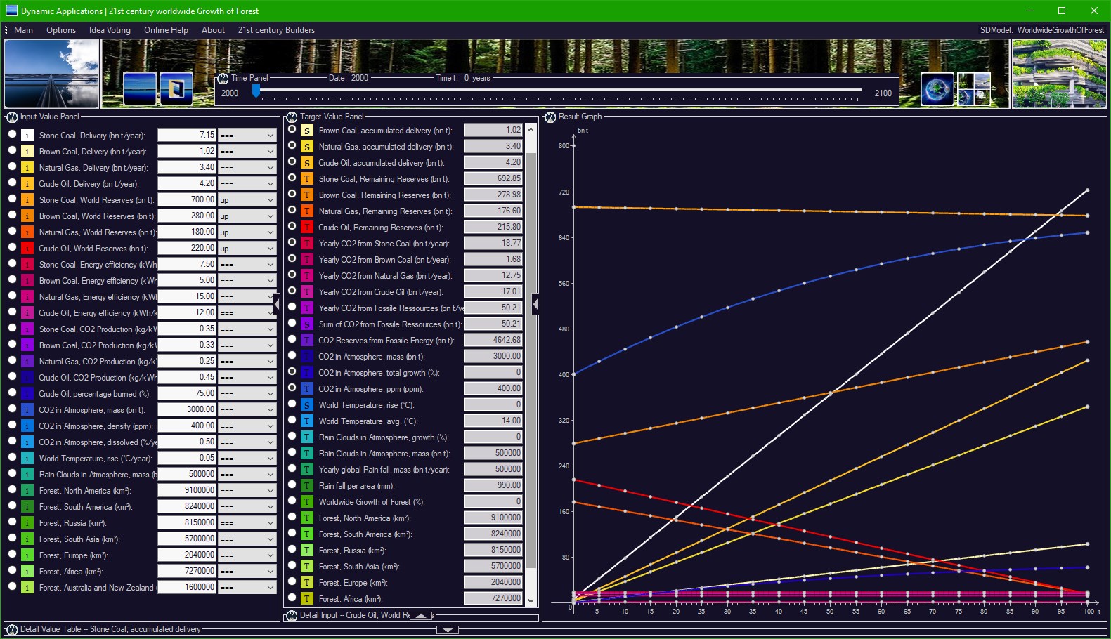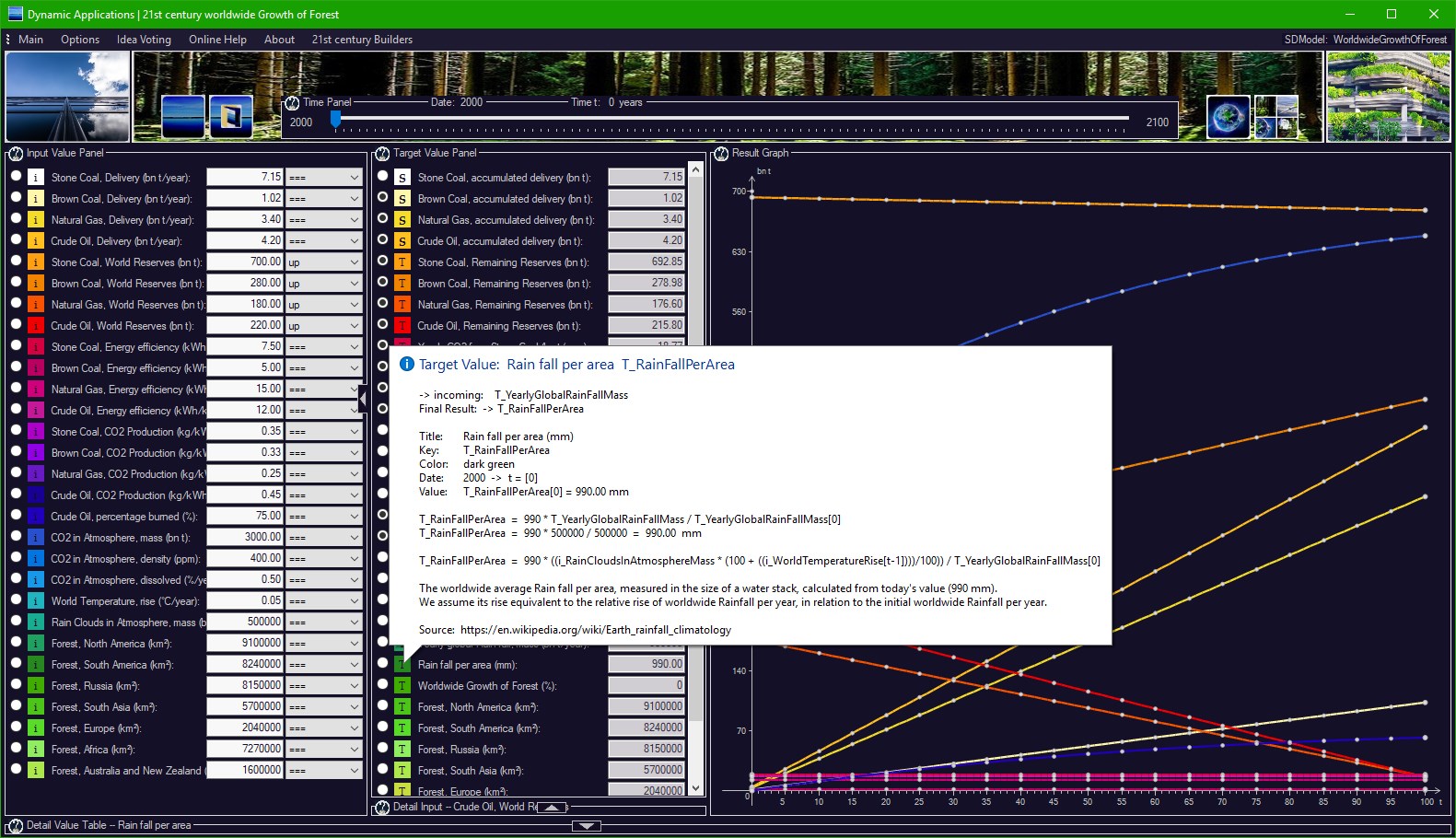 Fossile Ressources: Stone Coal, Brown Coal, Natural Gas, OilDelivery and Expectations (let ressources rise or fall over time).Input Values taken from Wikipedia, documented in ToolTipsCalculates the total amount of CO2 from burning fossile ressources over timeCalculates CO2 in the atmosphere in billion tons, and in ppmEstimates Evaporation, Clouds and Rainfall from avg. World TemperatureEstimates the worldwide growth of Forest from 2000 to 2100Includes introductory bakery model, a simple tutorialIncludes a simple PV System amortization calculation for the fans of renewable energies.