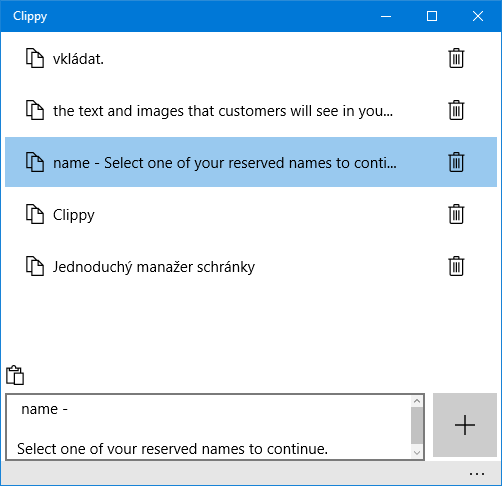 Clippy is simple clipboard manager. Save the text to the clipboard using ctrl-c and paste it into the Clippy's pouch by pressing +. You can insert a variety of texts in the pouch. Then you can click on the selected text and press ctrl-v to paste.