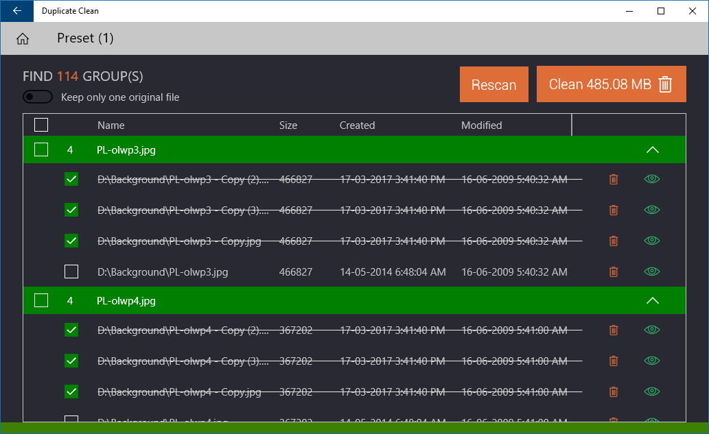 3. Auto keep original files ( you can select option: Keep all original files or keep only one original file) base on advanced filter algorithms by: