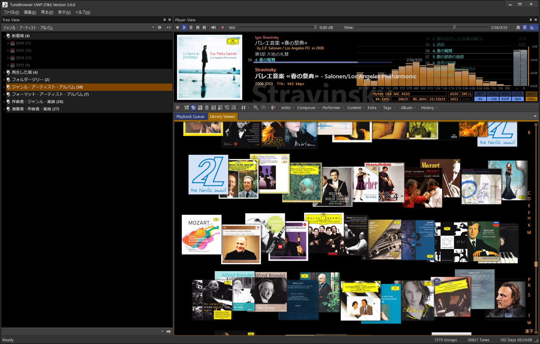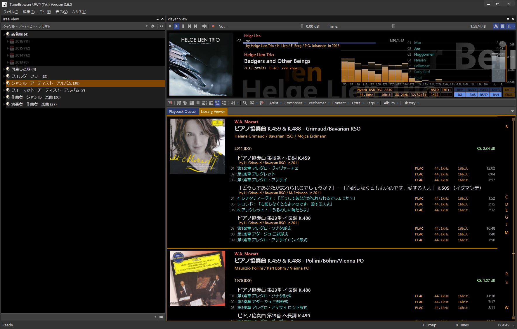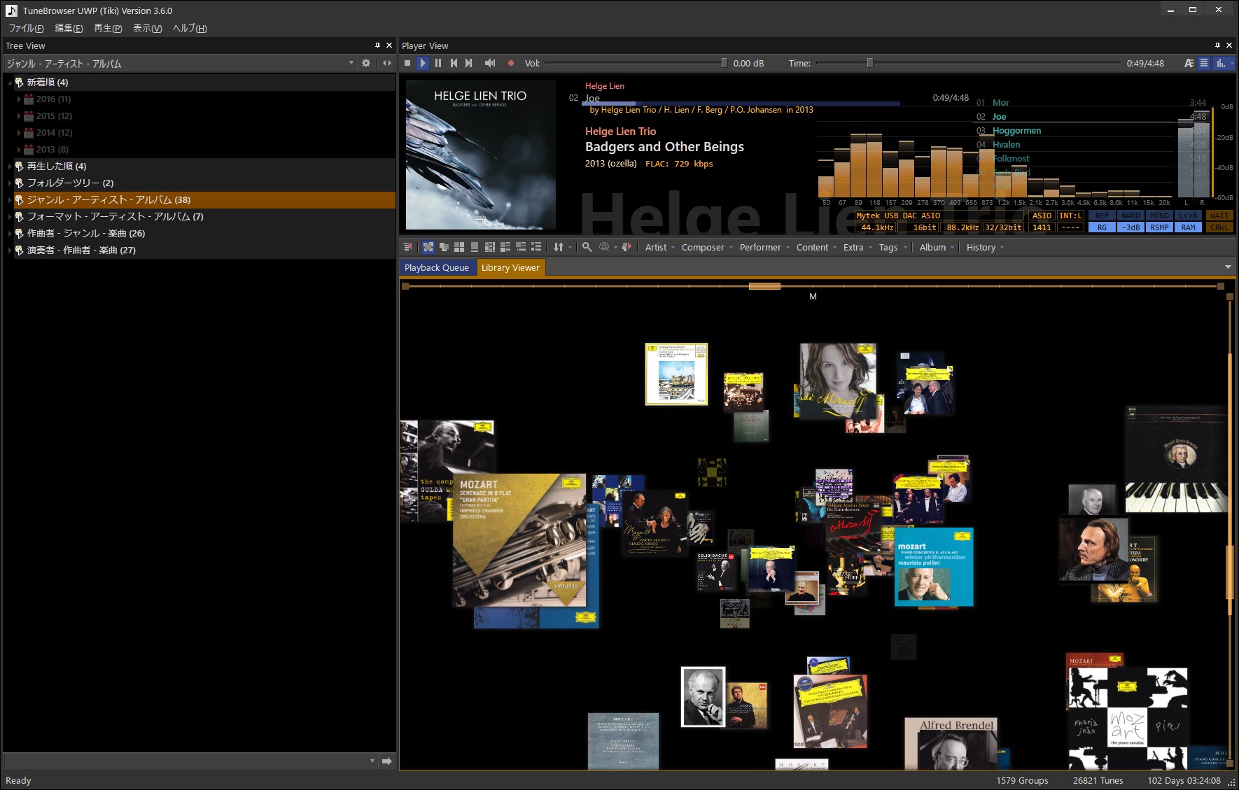 Supporting file types are: DSD, FLAC, TTA, MP3, AAC, ALAC, Ogg Vorbis, WavPack, Wave, AIFF, APE and WMA. Using own playback engine. Supporting gapless playback in all formats including DSD. Dynamic and smooth graphic rendering by DirectX (Direct2D). Supporting OpenHome. You can control the TuneBrowser with iOS/Windows tablets or smartphones.C ++ template and internal structure utilizing CRTP, low CPU load. Associative search is easily possible under various conditions such as artist, composer, performer, content name. Considering not only rock and jazz but also classical music to be able to adequately manage.Full Unicode support. Supporting Last.fm Scrobble.Supporting VST3 plugins