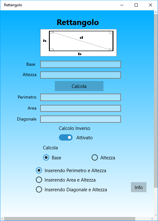L'App Rettangolo calcola Perimetro, Area, Diagonale, Base, Altezza del Rettangolo. Calcolo Diretto e Calcolo Inverso.