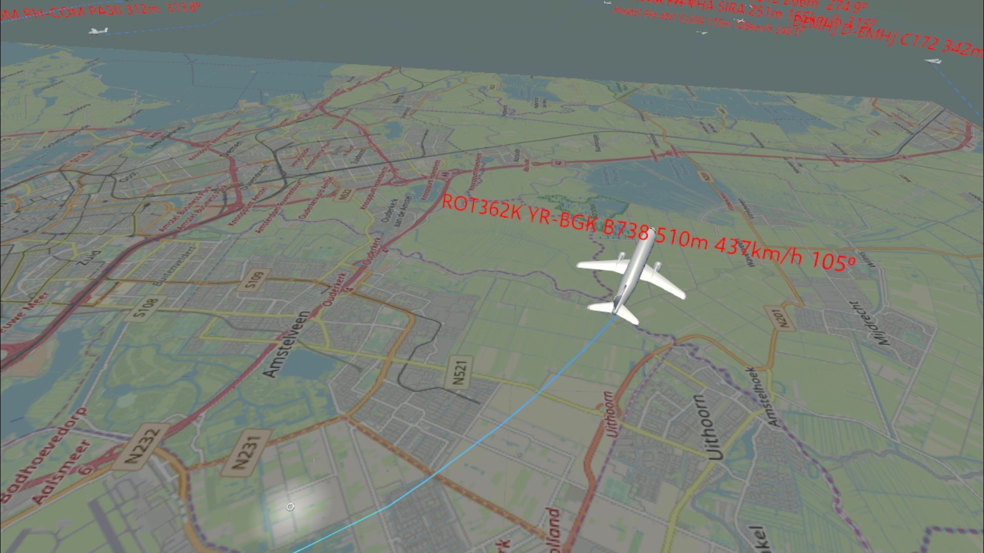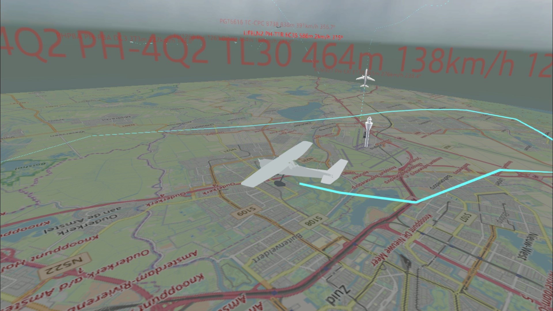 Shows 6 different types of aircraft. Watch for the hospital helicopters landing on South East Amsterdam, and all the way to the east you will find a lot off Cessnas flying around in the weekend.