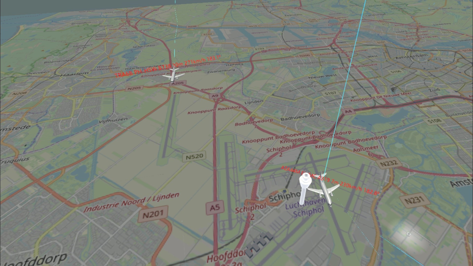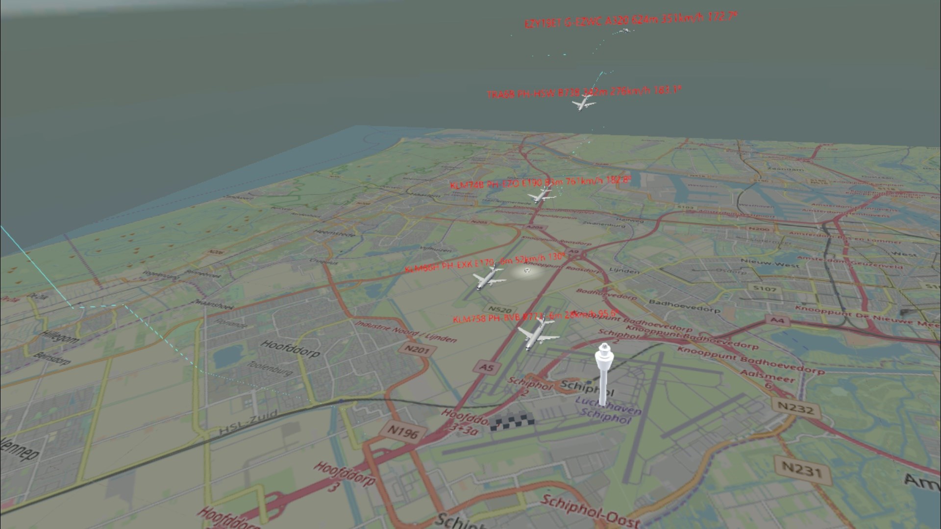 Shows LIVE air traffic 50 km around Schiphol (AMS Airport) in near real-time.