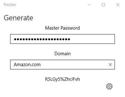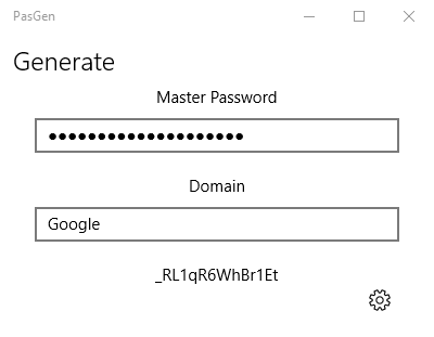 PasGen uses a robust SHA256 hash of your Master Password and the specified Domain to generate a random-looking password. PasGen also ensures that your password will meet the vast majority of password requirements by always containing at least one number (0-9), lowercase letter, uppercase letter, and special character.