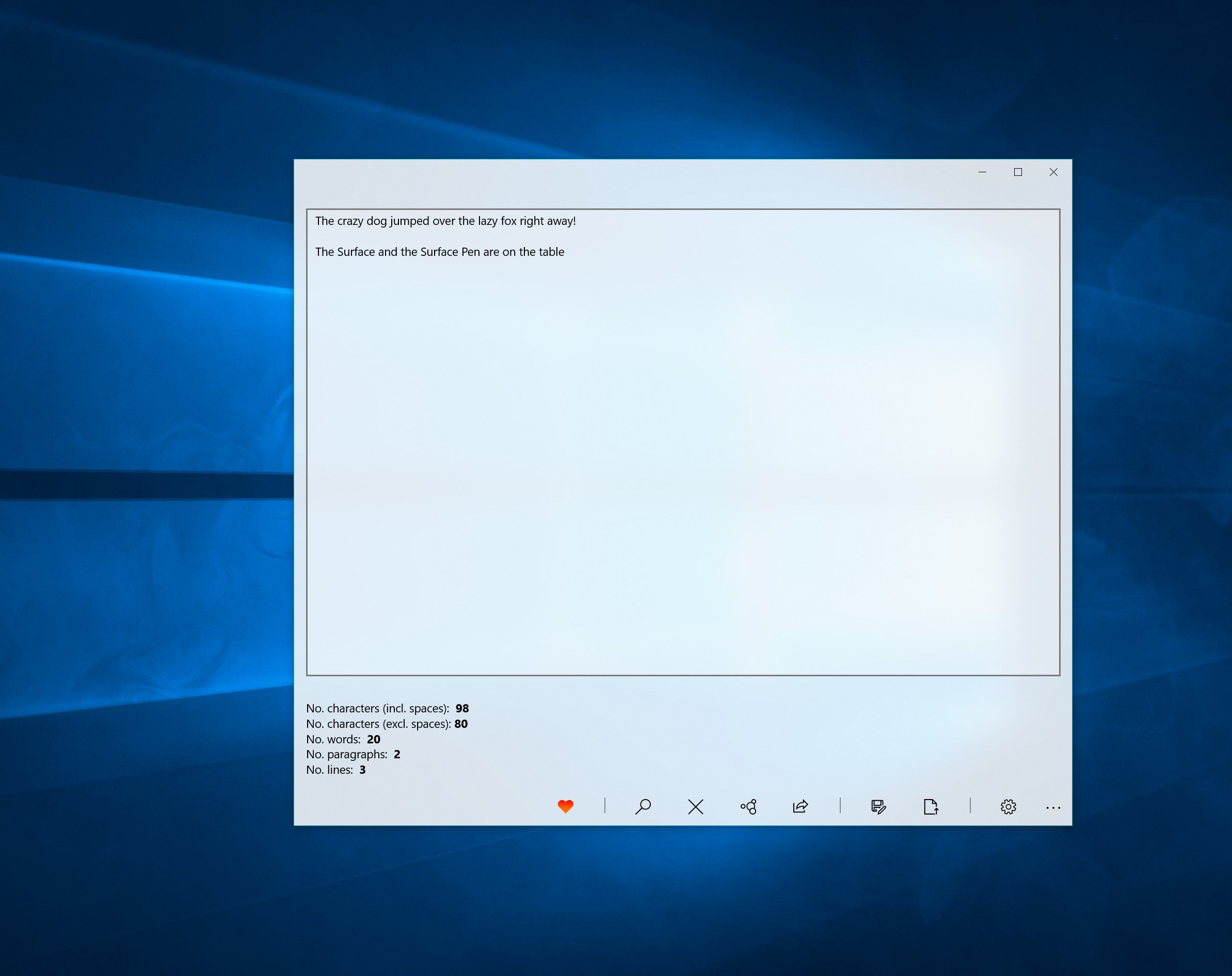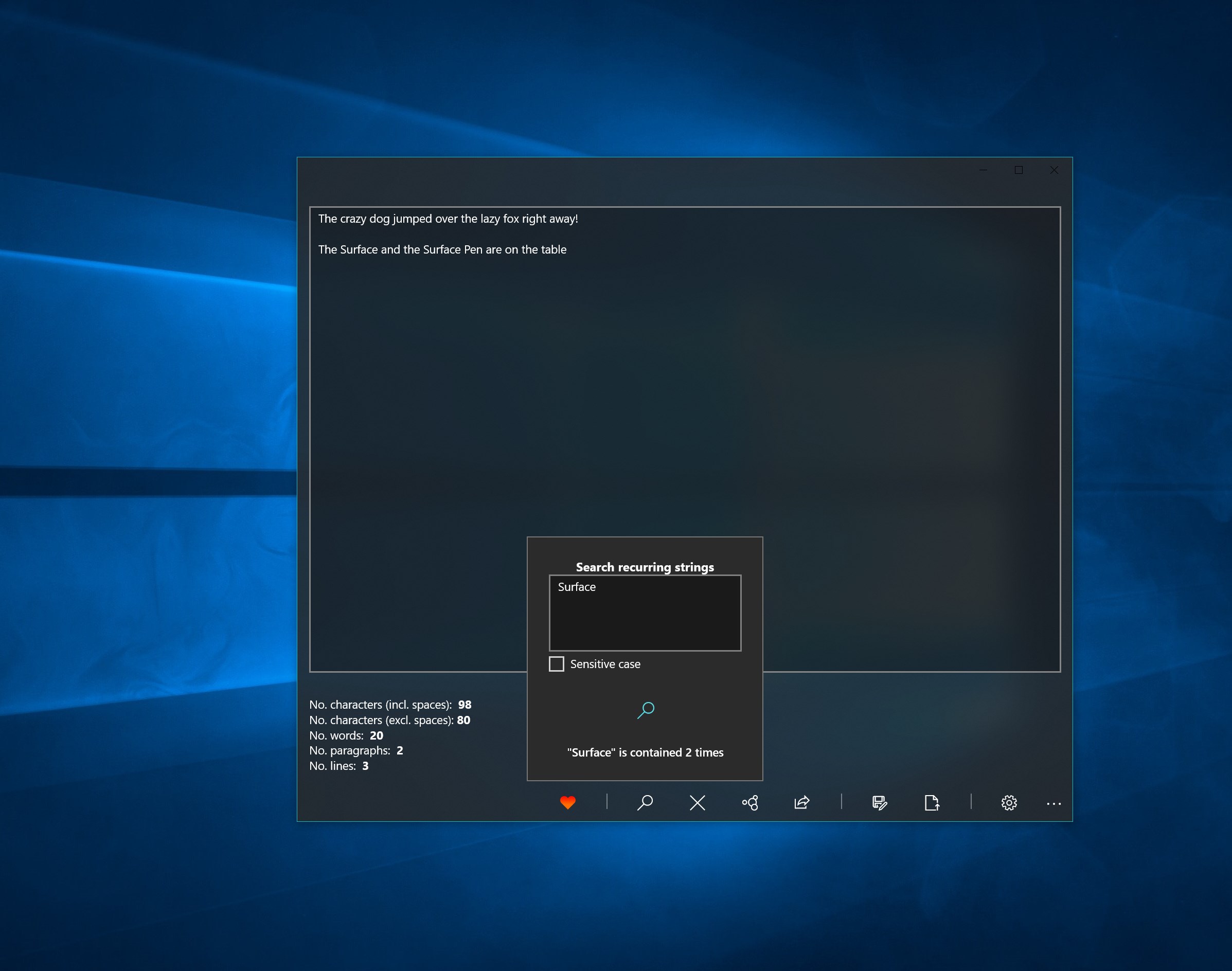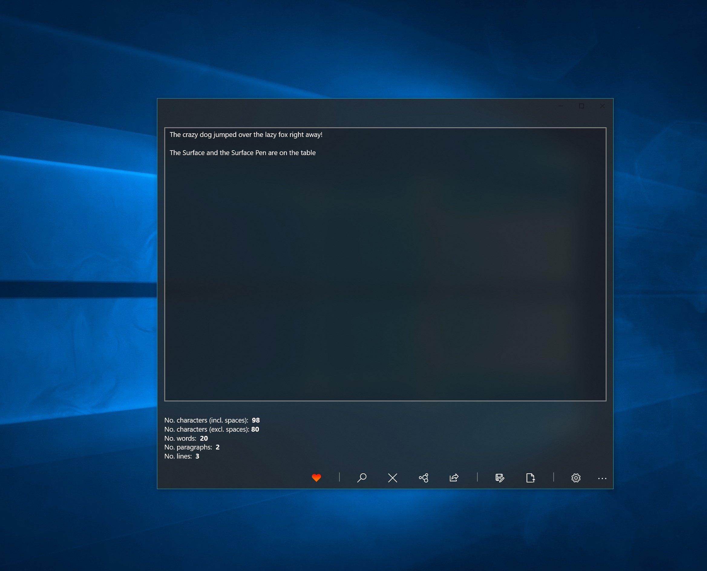 Detect the numer of characters, spaces, words, paragraphs and lines into your textEasily transfer text across multiple Windows 10 devices, by saving and loading plain text in local and roaming storageLoad and save plain text in .txt fileSearch for recurring sets of charactersShare the text through other appsHighly customizeable, with 10 different themes and custom transparency levelVarious rules to make the counter more flexible to your needs
