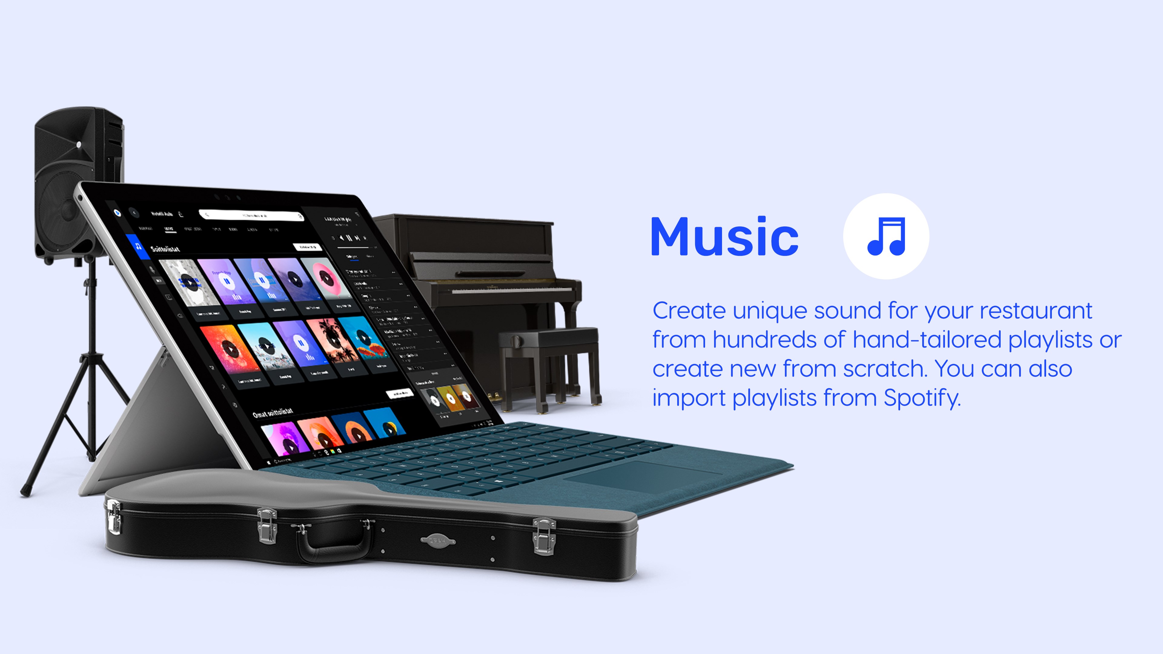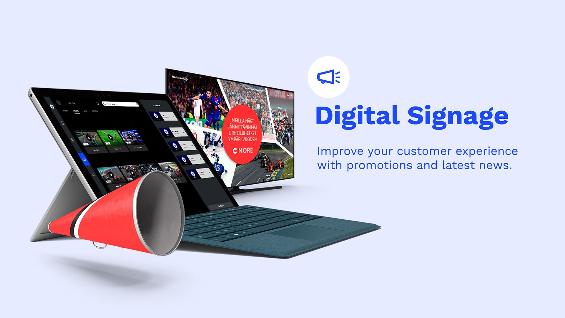Music, millions of tracks and hundreds of professionally tailored playlists. Ability to import your own Spotify-playlists.Karaoke, tens of thousands karaoke tracks, new releases every week.Sport ChannelsJukebox, let your customers decide the music with their own phones from a predetermined library. Also available for karaoke.Digital Signage, display advertisements of your choosing.