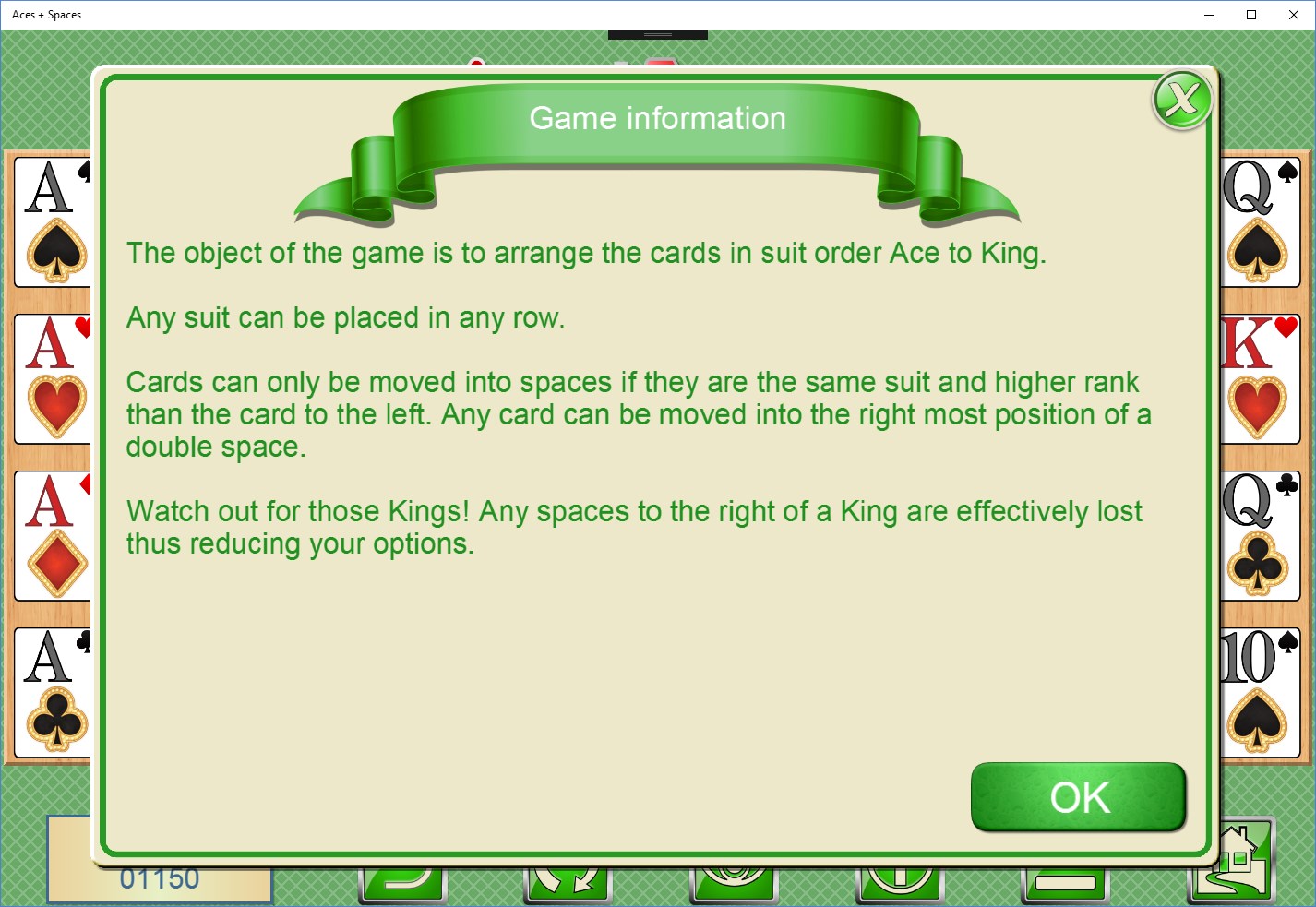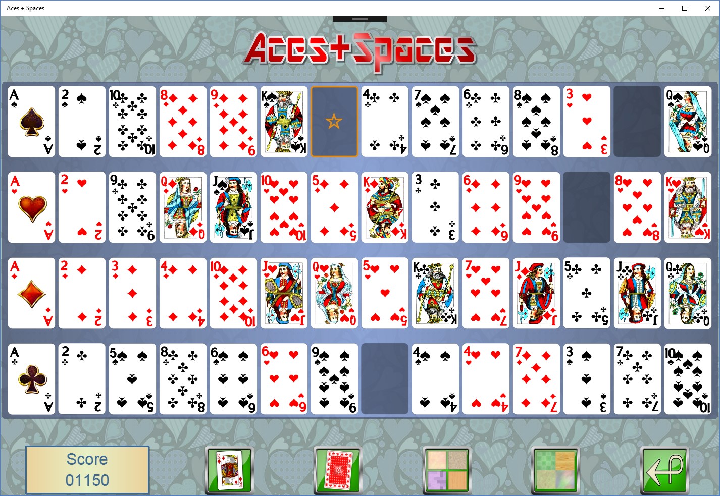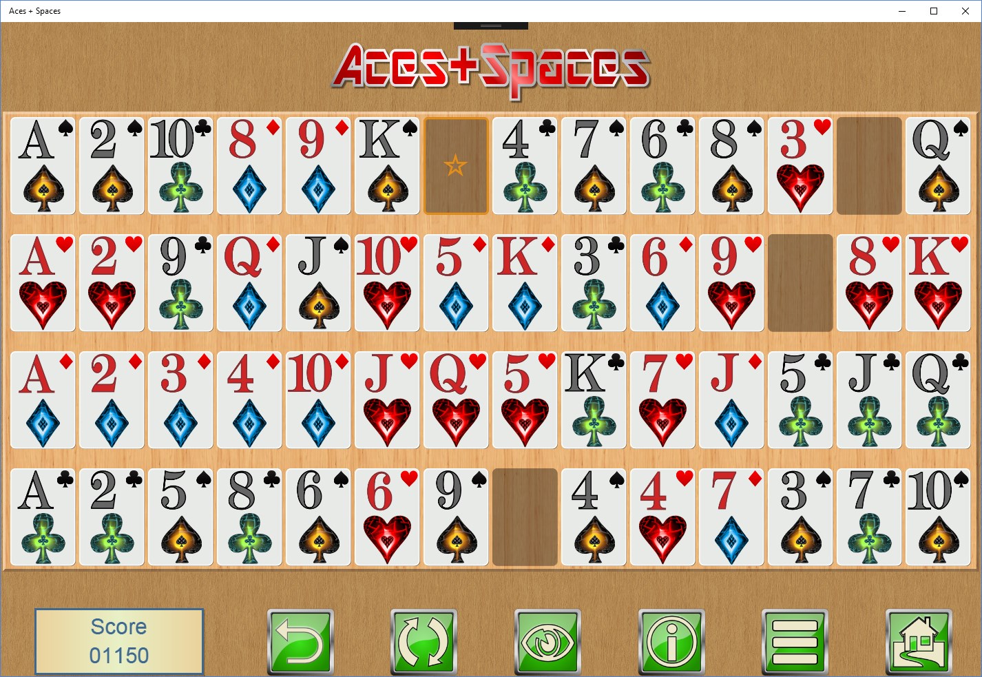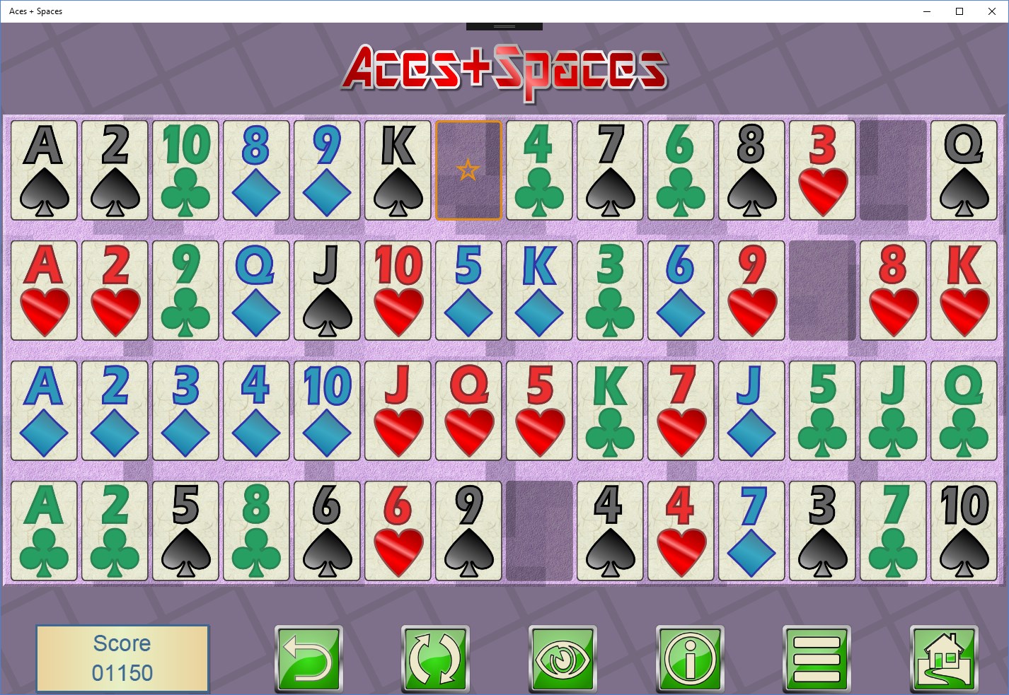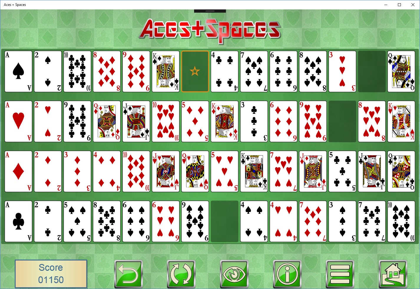 Aces + Spaces is a highly addictive card solitaire game played with a standard pack of 52 playing cards providing endless hours of fun and entertainment. This classic card game is easy to play yet tricky to master so if you are up for a challenge give it a go.