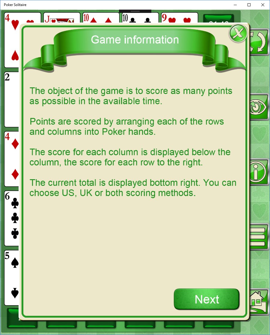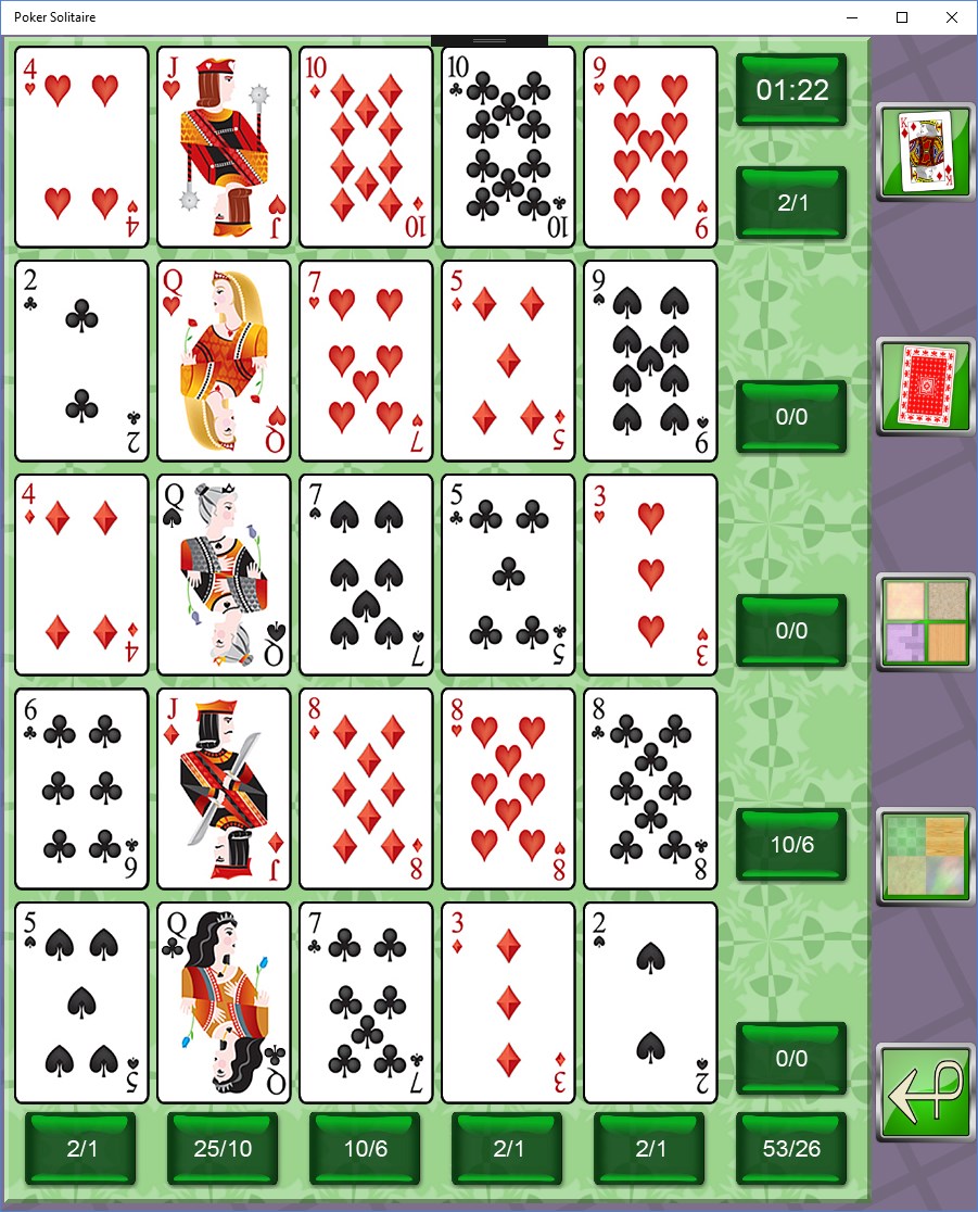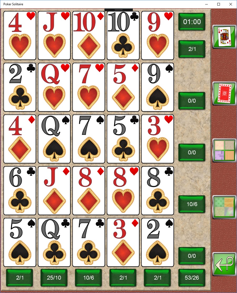 Thirty five cards are dealt to a square of five rows and five columns. Your task is to simply rearrange the cards into as many different poker hands as possible. The better the poker hand, the higher you score.