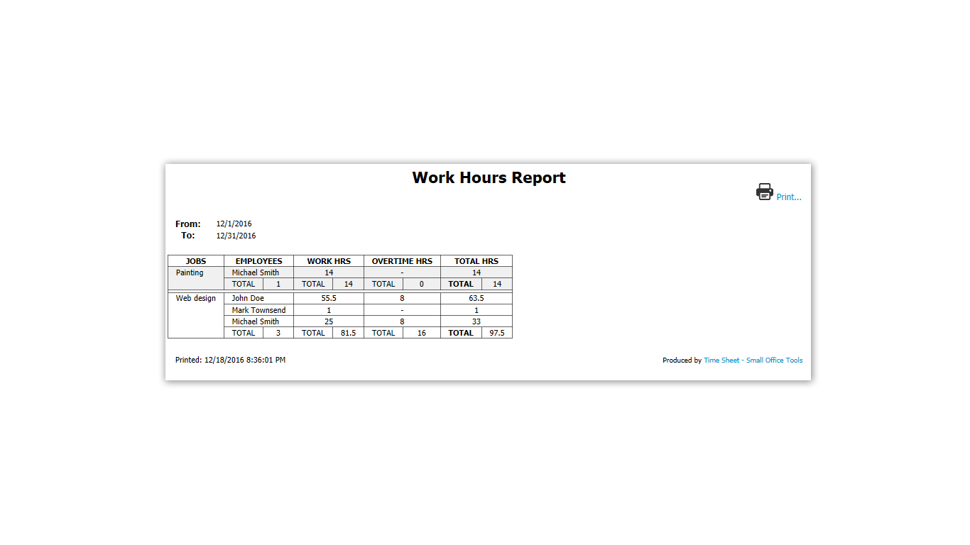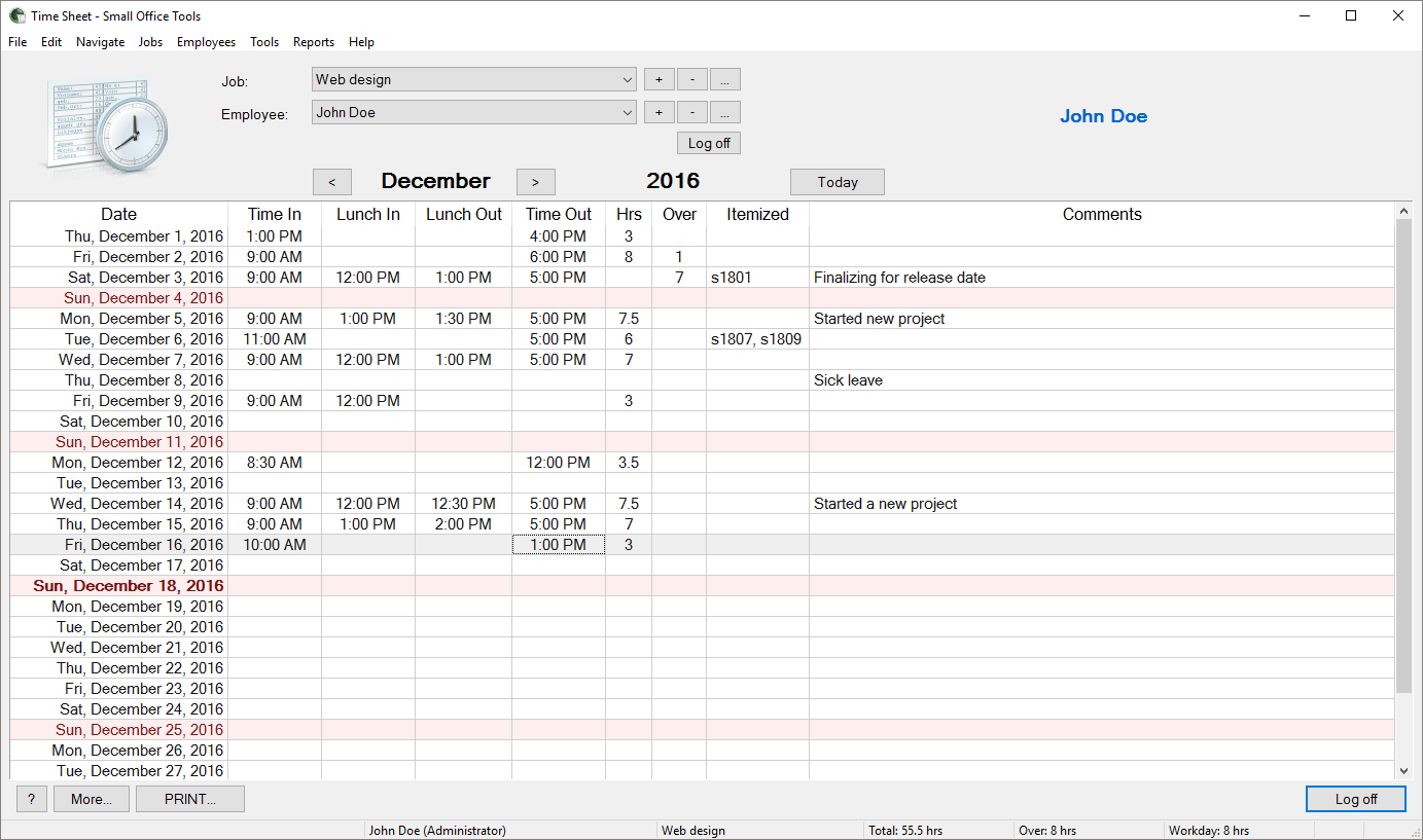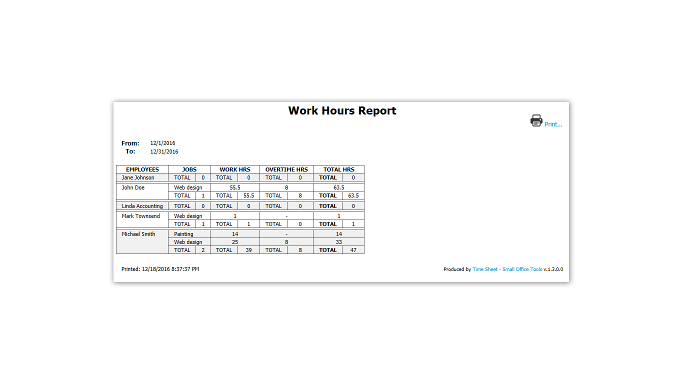 Time Sheet app is designed to help freelancers & small business employees to keep track of their work hours by providing means to enter, monitor and generate reports of time worked.Intuitive, easy-to-use interface to enter work hours and navigate through time records.Support for multiple job records.Support for multiple employee accounts with different account types.Each job and employee account is highly customizable.Ability to protect each employee account with a password.All previous time sheet records remain available for later retrieval.Safe & secure storage of the time sheet records.Ability to print customizable employee time record reports.Ability to import and export time sheet database for easy exchange between several copies of the app.Support for international formats of dates, time and numbers.We\'re striving to provide a multi-language interface as well.We designed this software having a hands-on experience in running a small business.