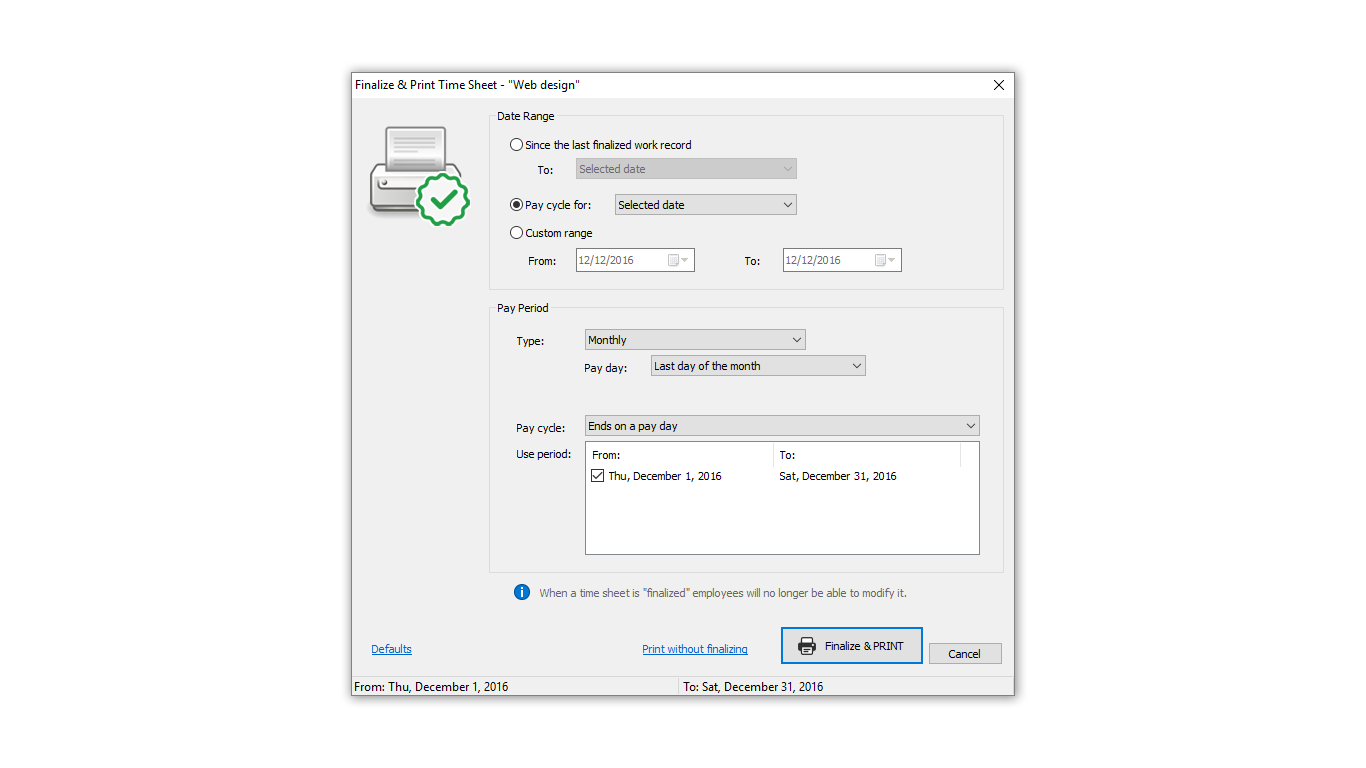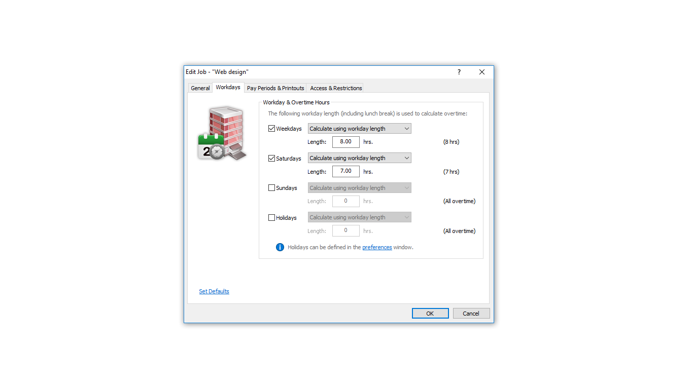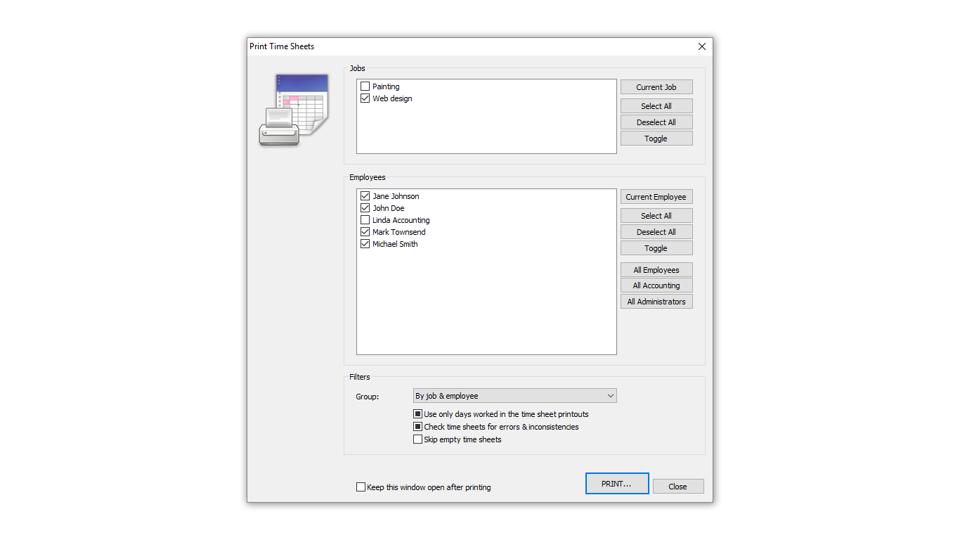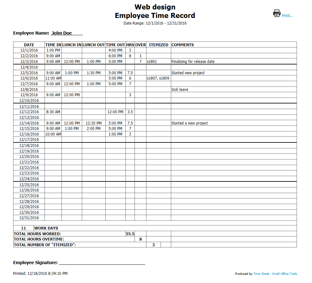 Time Sheet app is designed to help freelancers & small business employees to keep track of their work hours by providing means to enter, monitor and generate reports of time worked.Intuitive, easy-to-use interface to enter work hours and navigate through time records.Support for multiple job records.Support for multiple employee accounts with different account types.Each job and employee account is highly customizable.Ability to protect each employee account with a password.All previous time sheet records remain available for later retrieval.Safe & secure storage of the time sheet records.Ability to print customizable employee time record reports.Ability to import and export time sheet database for easy exchange between several copies of the app.Support for international formats of dates, time and numbers.We\'re striving to provide a multi-language interface as well.We designed this software having a hands-on experience in running a small business.