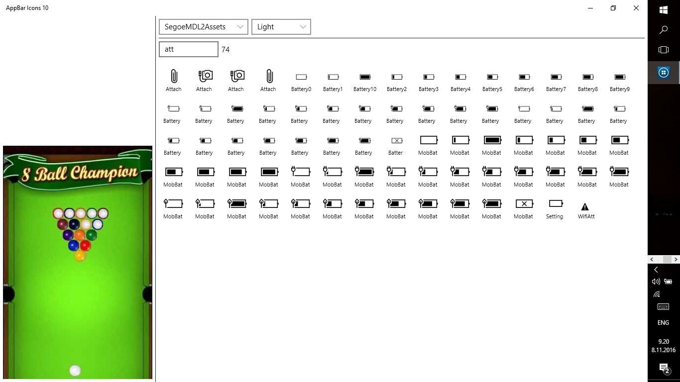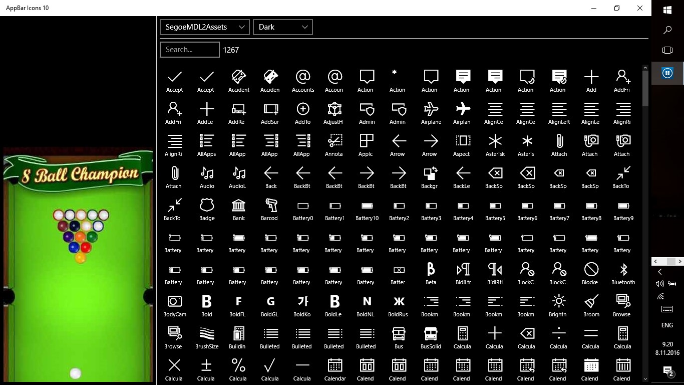 Symbol icon browser. (Segoe MDL2 Assets, Windows.UI.Xaml.Controls.Symbol enumeration).