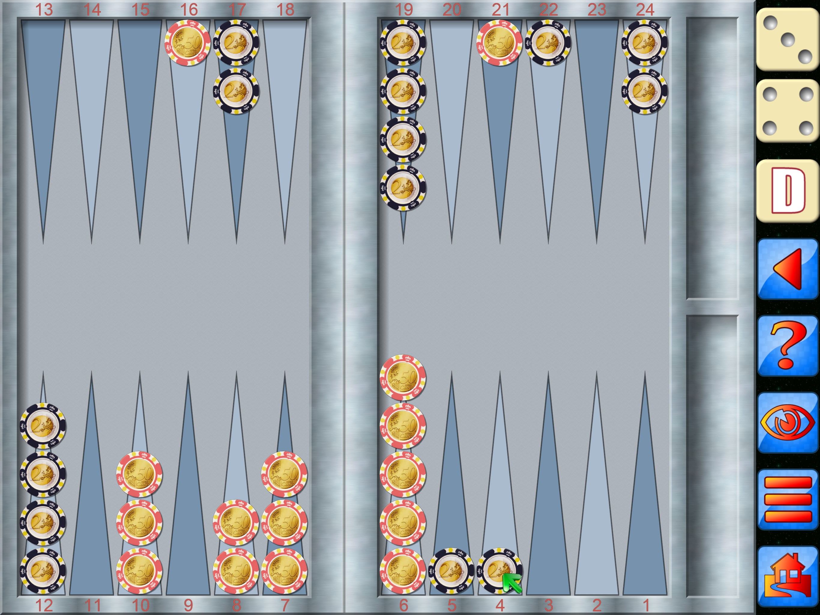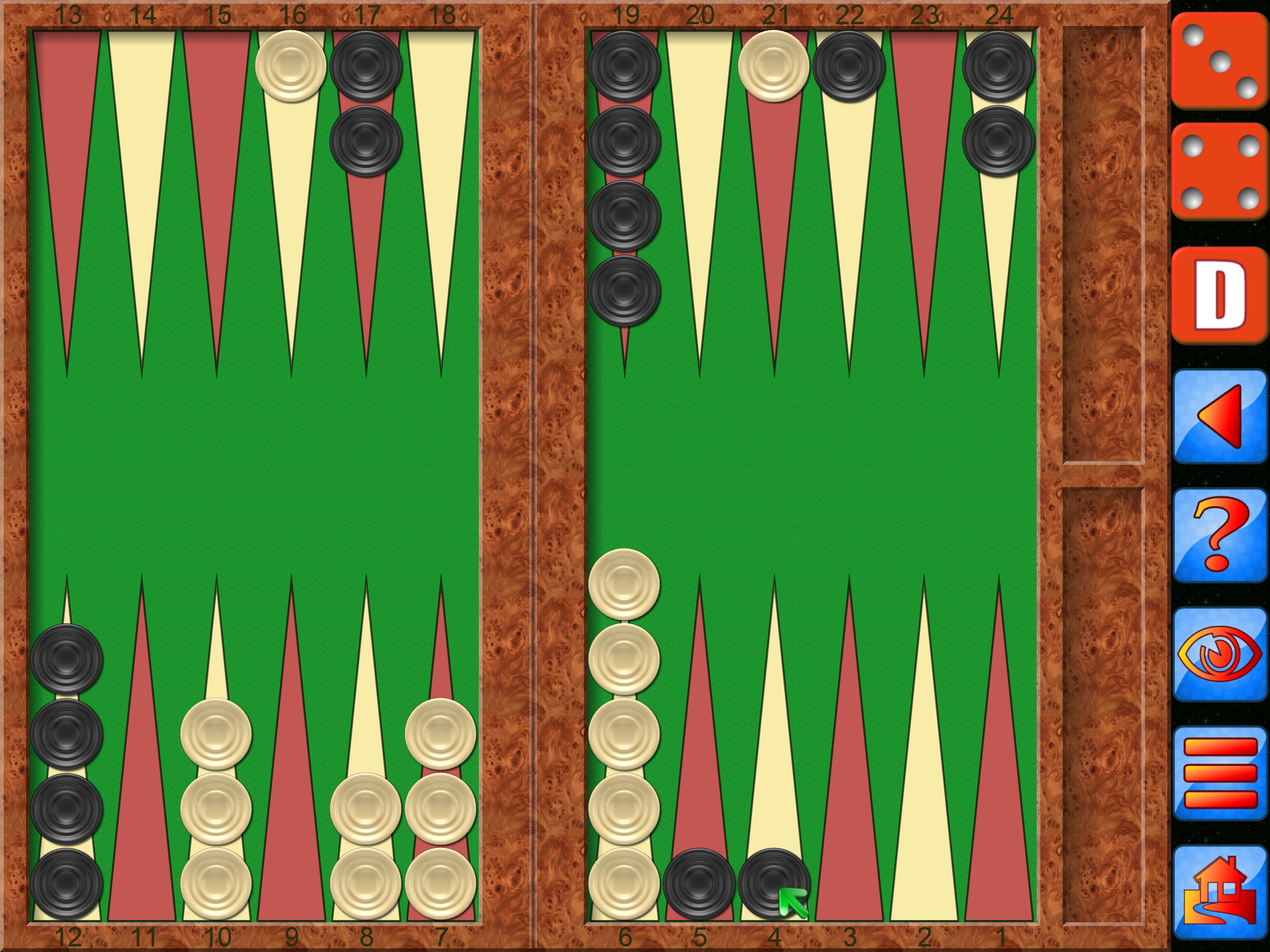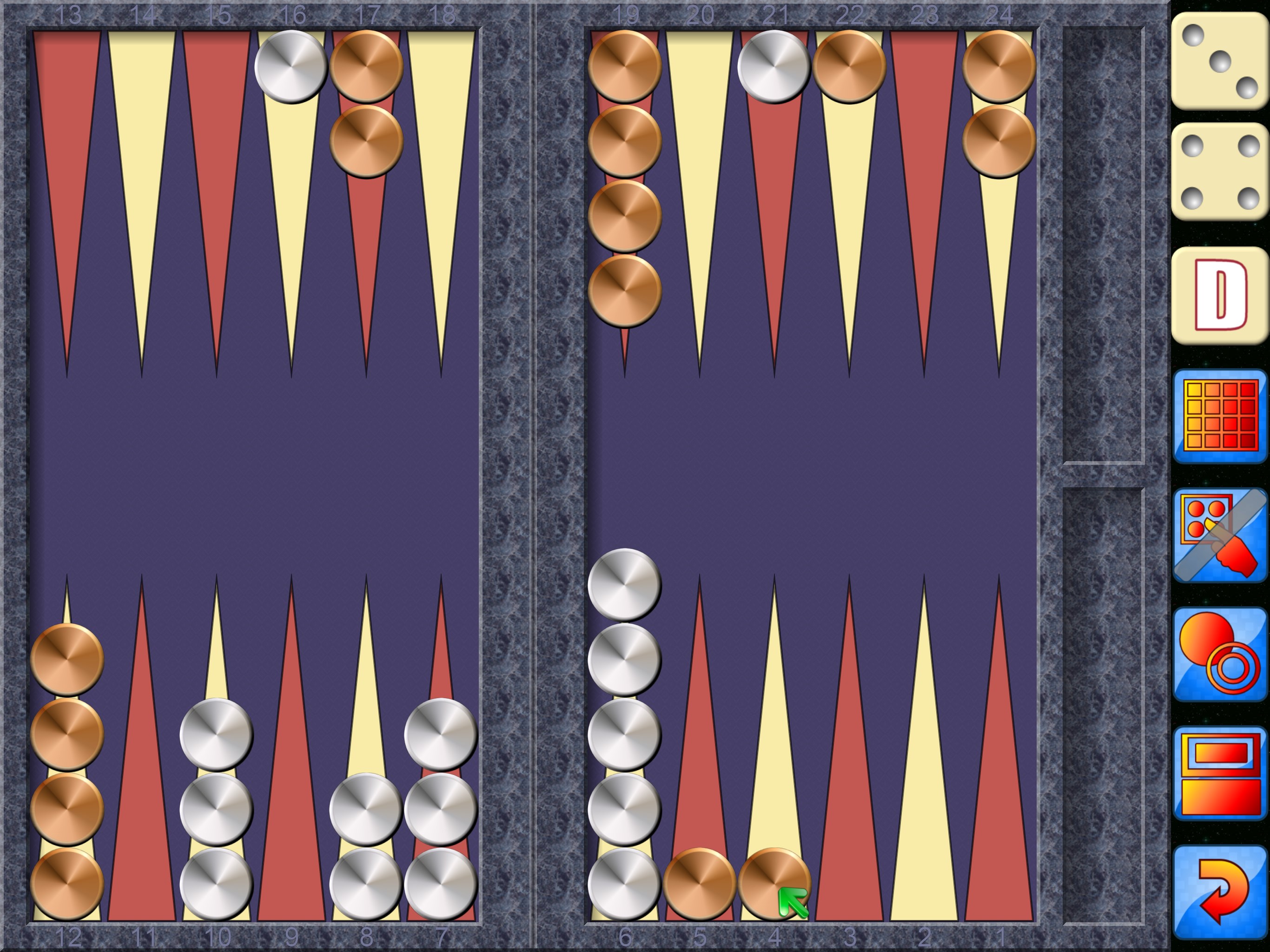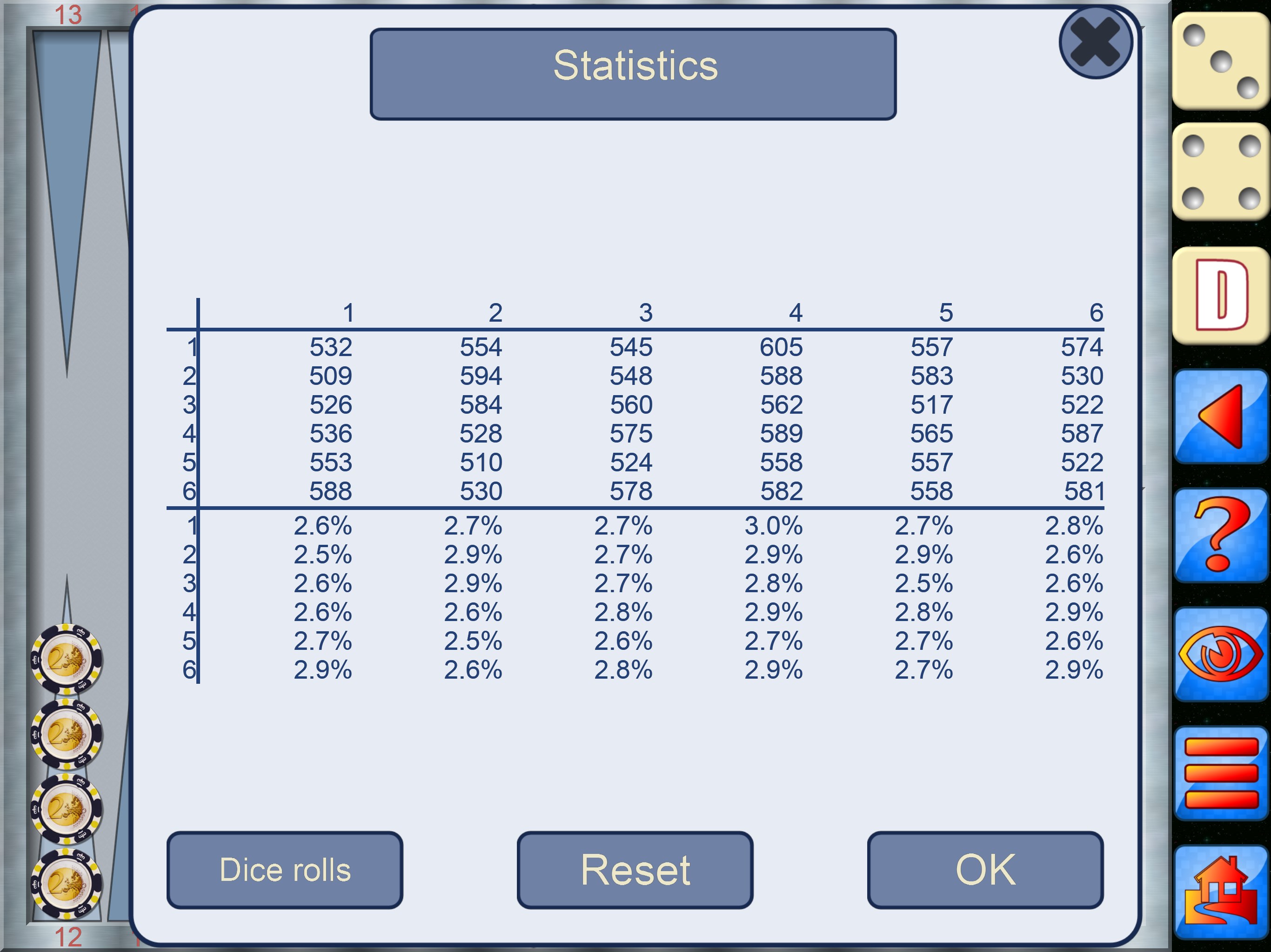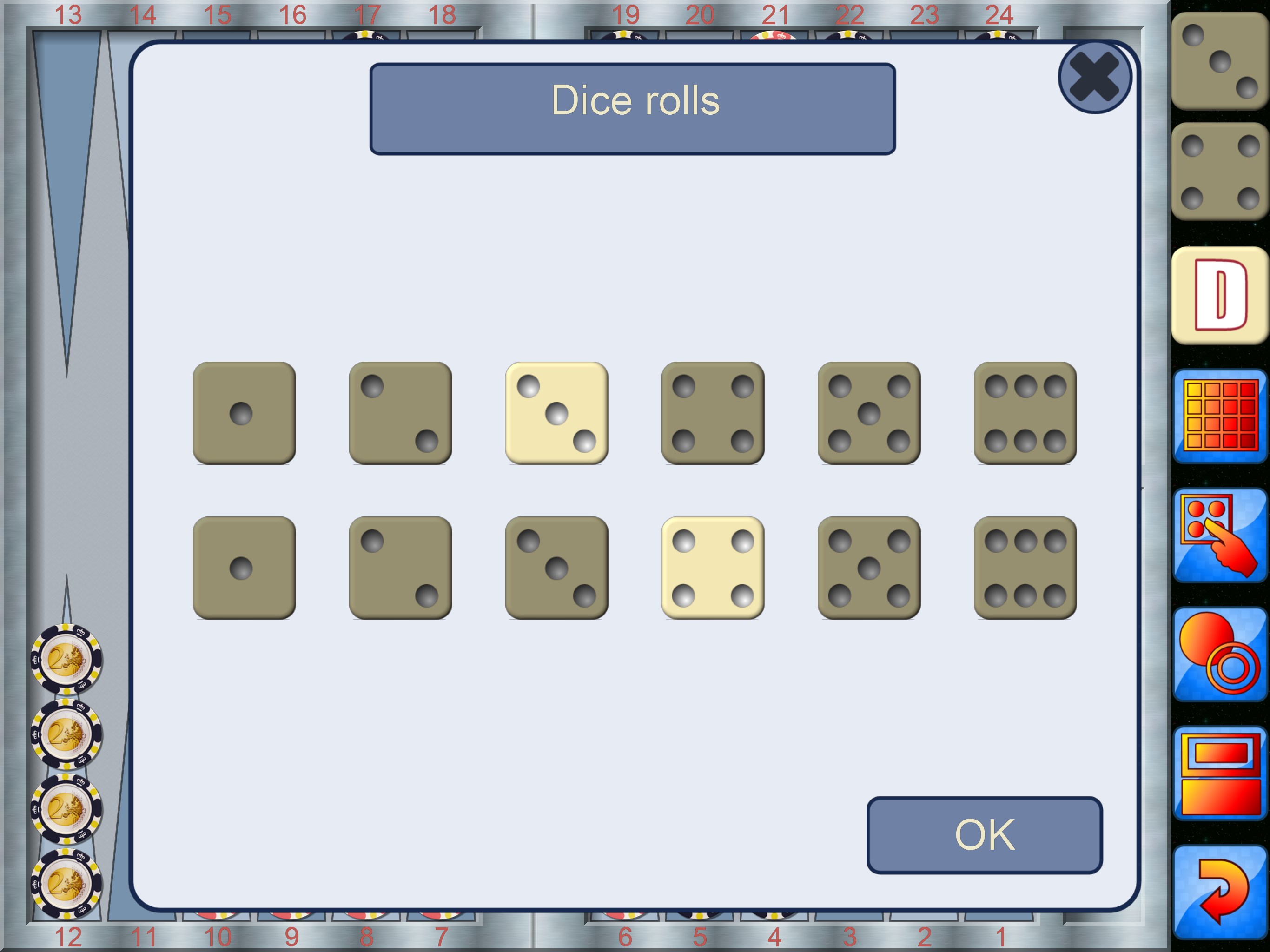 A common complaint against all Backgammon dice games is that it cheats. So does it cheat? absolutely not, what would be the point? Still don’t believe us then roll your own dice outside the game and enter those values to play against any of the game levels. Backgammon also keeps track of all the dice rolls so you can check on the game yourself.