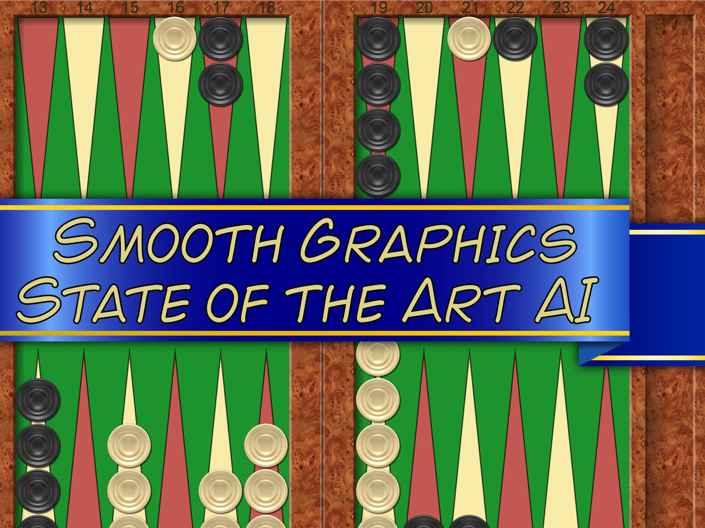 Play against the computer or another human player on the same device.Multiple levels of computer play, ranging from beginner to expert.Optional play with doubling dice.Support for alternate boards and pieces.Understands all the official rules of Backgammon, particularly those concerned with bearing off.High quality artificial intelligence engine particularly at expert level.Enter your own dice valuesMore AI than you can shake a stick at