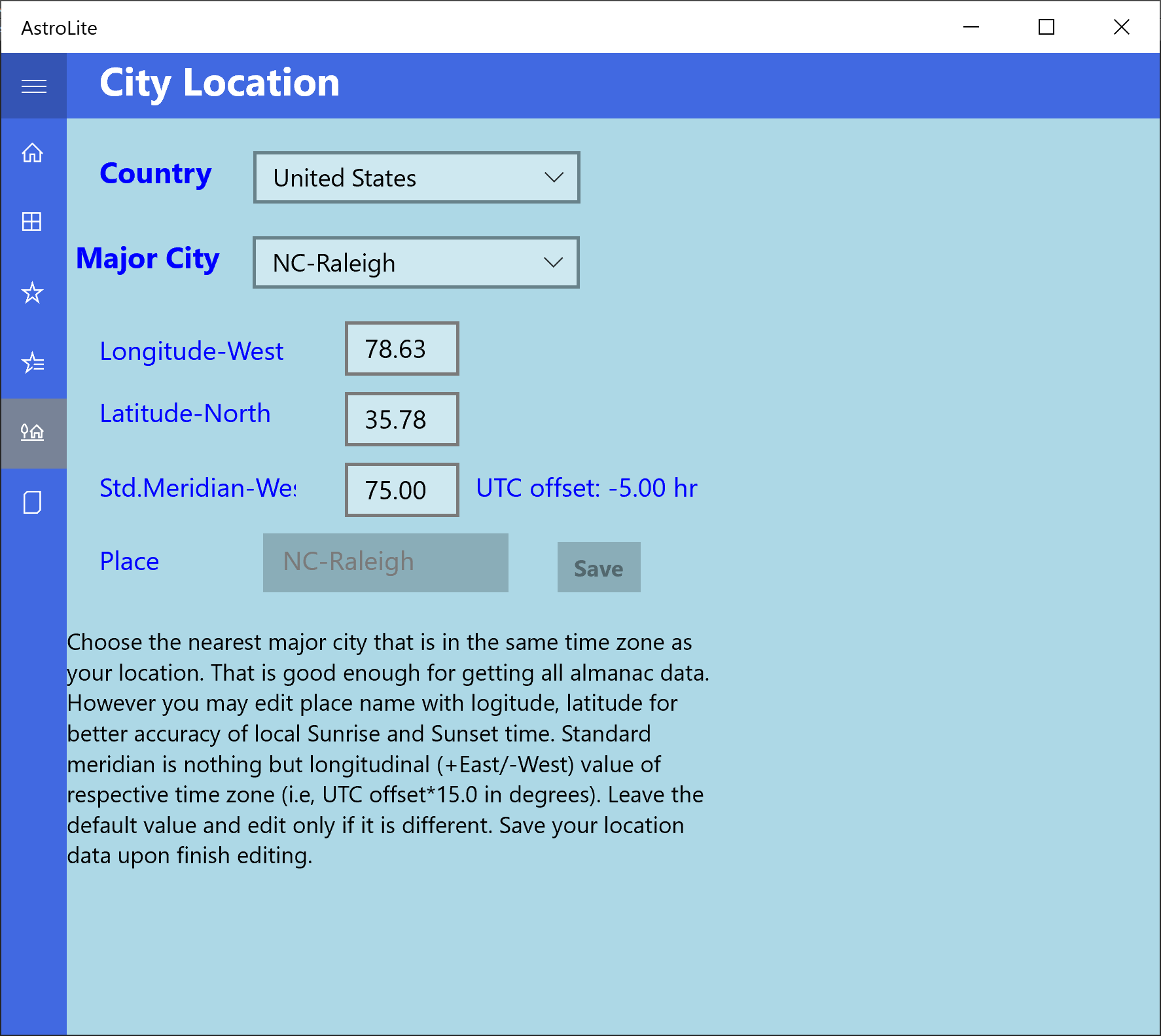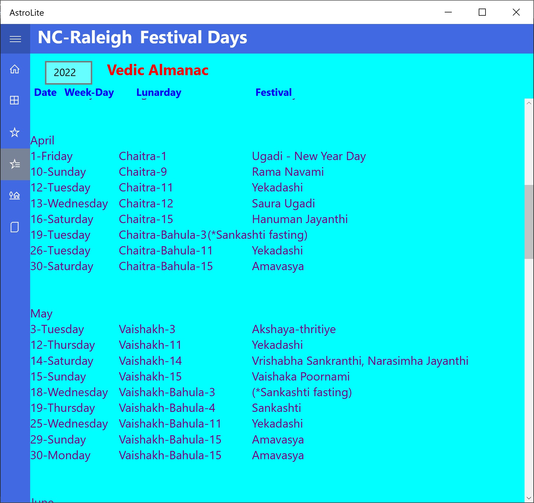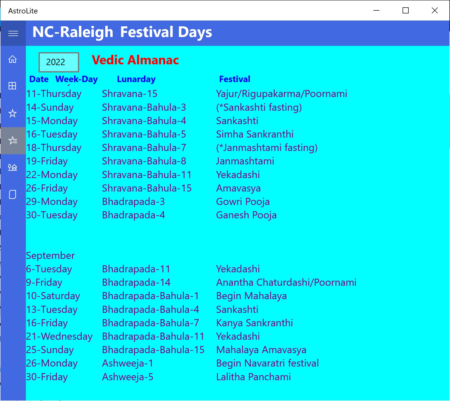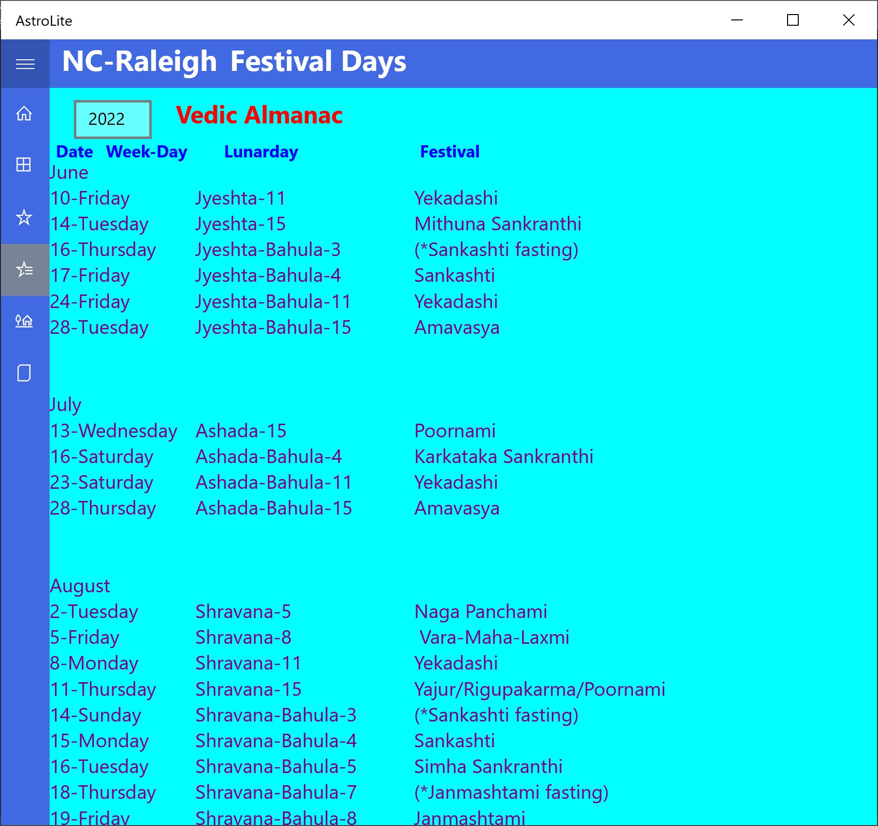 “AstroLite” is a basic version of AstroPro to keep track of days for Vedic rituals, fast, feast and festivals. While AstroPro is mainly for amateurs and professionals in Vedic astrology, AstroLite is for general public those who are interested in following Vedic traditions in day-to-day life. Users can set any major cities around the world and work with different key menu categories listed in the left pane and its features are discussed as follows.