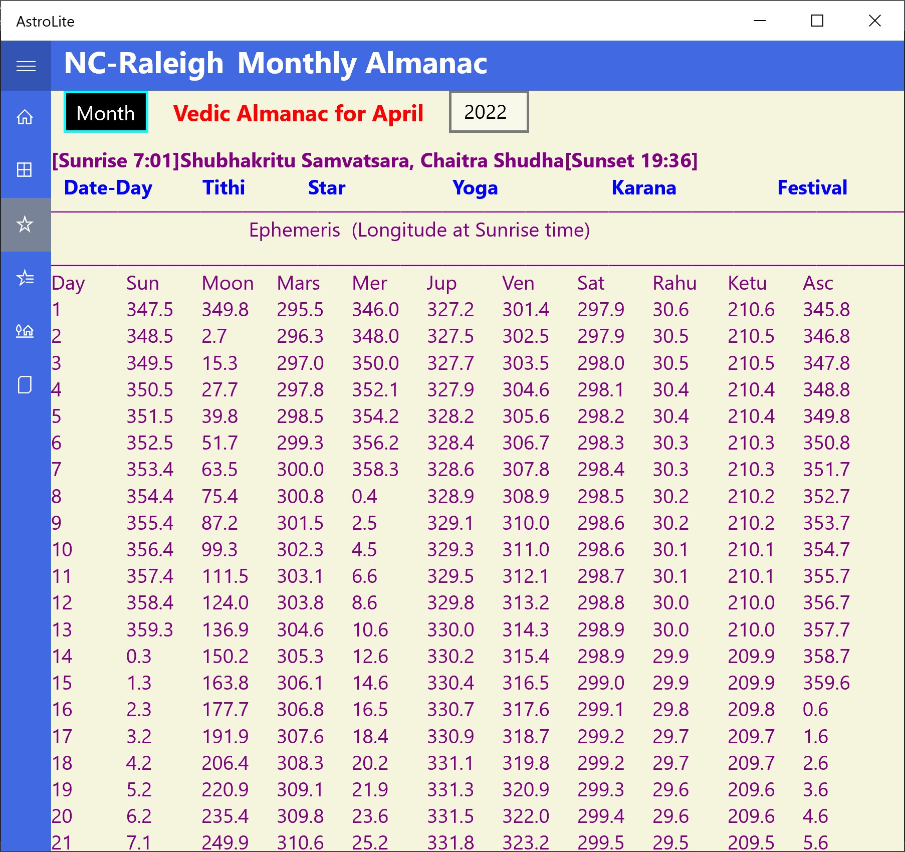 A reference guide for Vedic almanacProvides planetary positions for the given calendar date with zodiacal details.Provides calendar of Vedic rituals and festivalsGet ephemeris data for the given calendar month.