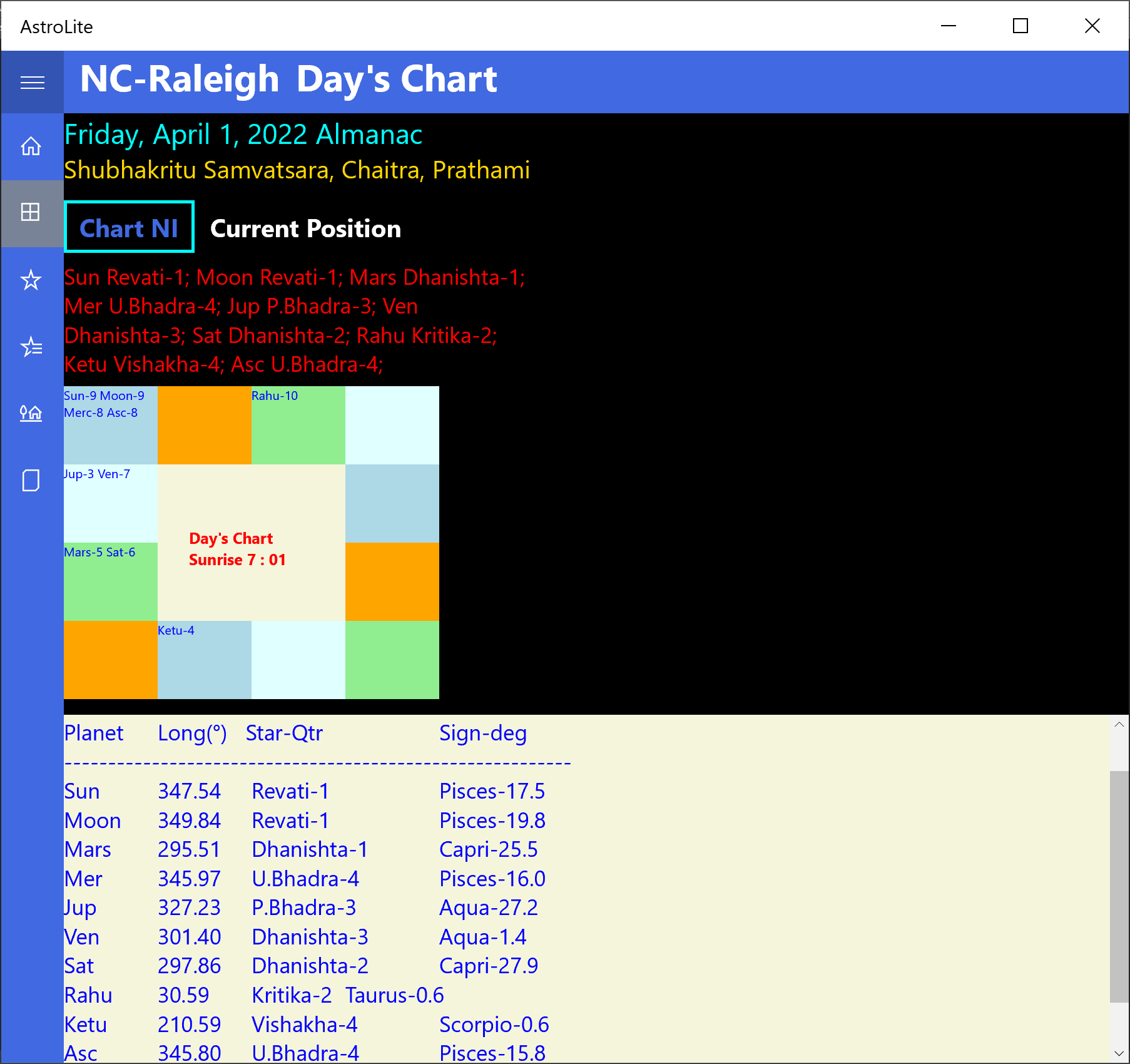 Planetary position and charts are displayed for the given calendar date. Charts can be displayed in either South Indian or North Indian formats. One can quickly switch between these chart formats using switch button as shown in the screen shots.