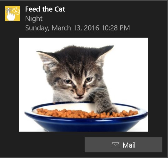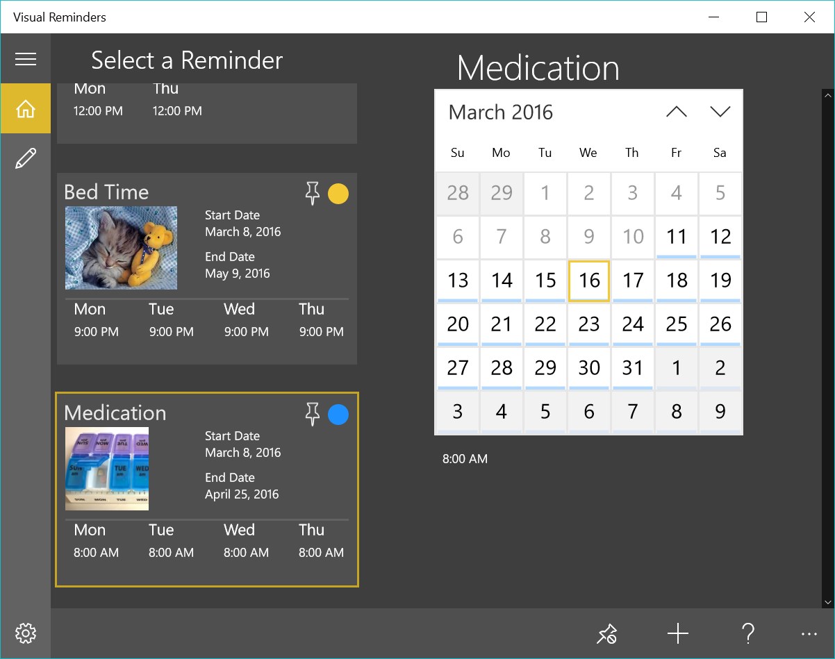 A reminder can be set to repeat for multiple times a day and for multiple days per weekA reminder can be set to repeat weekly, biweekly or monthlyA picture can be associated with the reminderAn audio message can be recorded to be played when the notification of the reminder is displayed (phone only)A live tile can be created for each reminder. The tile displays the times for the upcoming notifications The times on the live tile can be displayed as a picture or textA button can be added to the notification of the reminder that, when pressed, will send a predefined email message to a predefined recipientWhen designing a reminder, you can test it to see how it will look when delivered