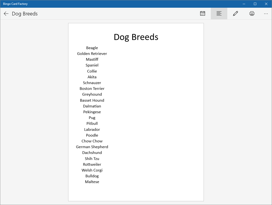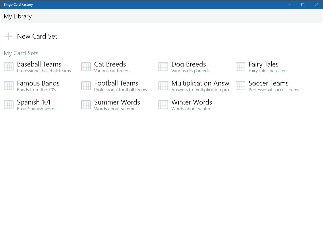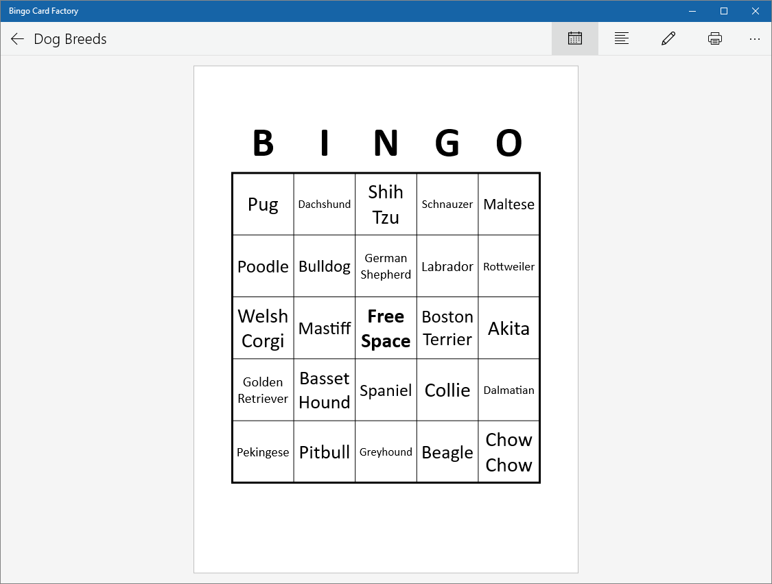 Quickly and easily create and print unlimited bingo cards from your Windows 10 computer or phone.