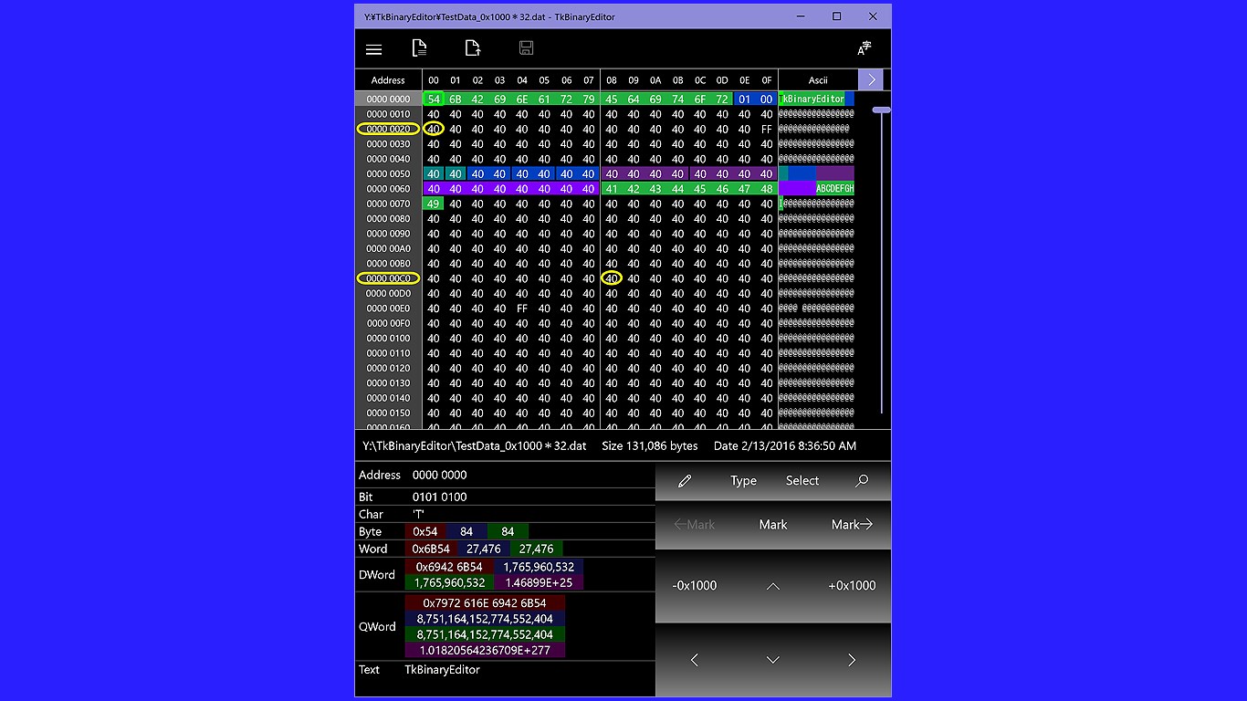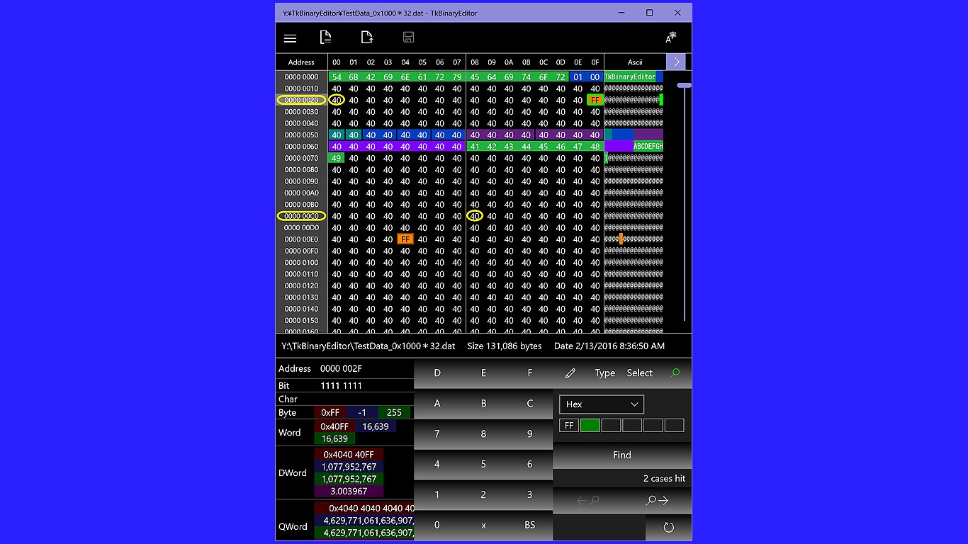Focus data is always showing values in the Bit,Byte,Char,Word,DWord,QWord,Text.You can color-code as Byte, Word, DWord, QWord, Text.Color-coded data is saved automatically , it will be reproduced when you open the same file.Color data to file and then save and read can be.Help you to analyze the file.Character codes that correspond to Ascii, UTF-16,UTF-16(BE),UTF-8.You can also search of a decimal number.Toggle between big-endianness and little-endianness.You cannot insert data, delete.