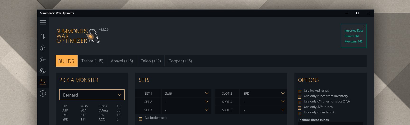 Summoners War Optimizer is a tool to find out the best individual rune builds for your monsters.